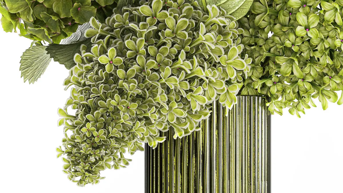 Beautiful lush bouquet of green flowers in a modern glass vase with hydrangea, lilac. Set 321.Decorative Bouquet of green flowers in a glass vase for decoration and interior.Bouquet of green flowersluxury decorvase - RILLA VASE - NORDALGreen flowersHydrangea - HydrangeaSyringa, lilac - lilacLilac, flowers, vase, green flowers