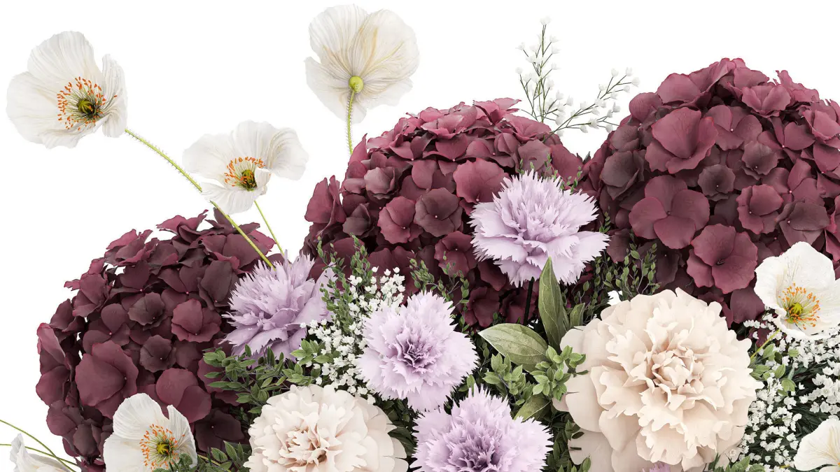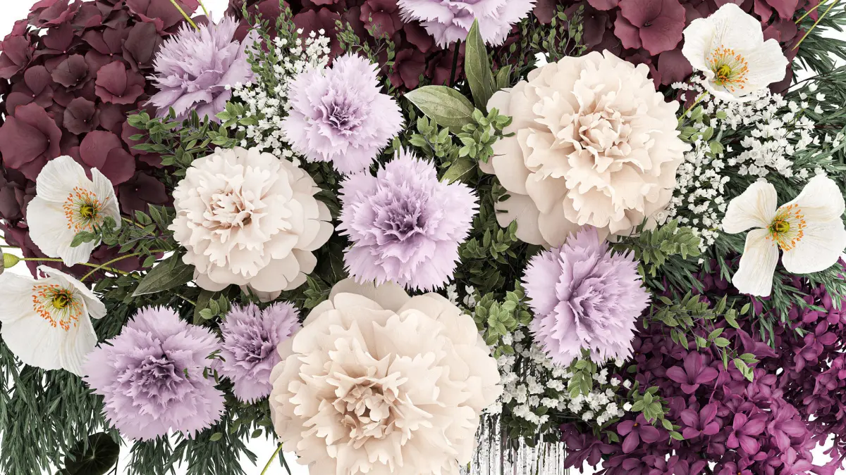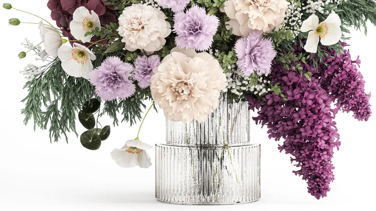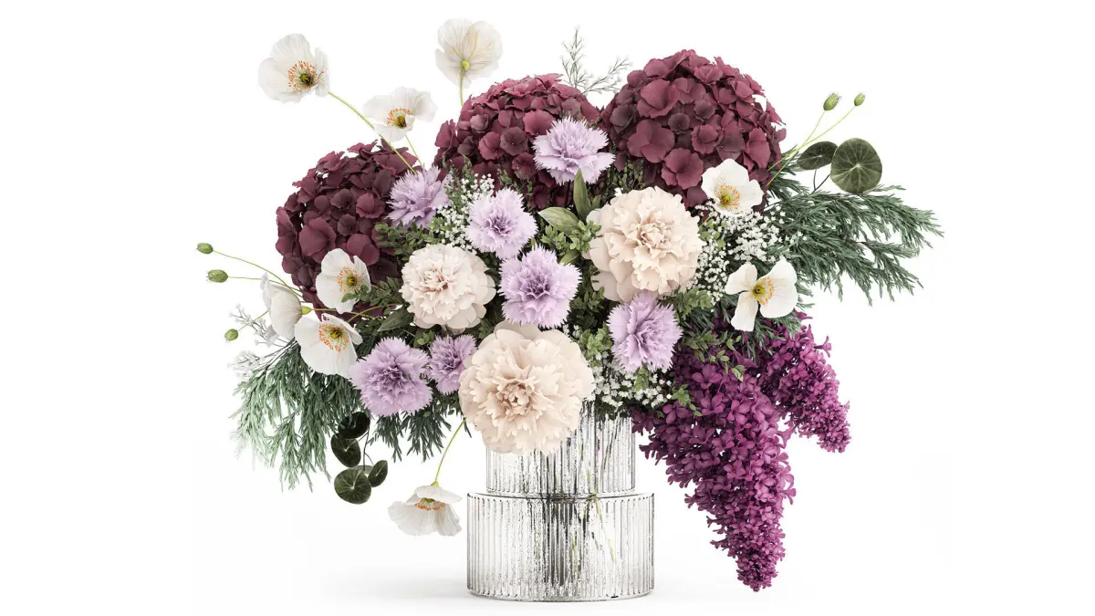 Beautiful small bouquet of lilac and white flowers in a modern glass vase, hydrangea, lilac, poppy, peonies. Set 437.Decorative Bouquet of flowers in a glass vase for decoration and interior.Bouquet of branches and flowersbouquet of green leaves and branchesvase with branches, branches in a vaseCorylus, filbert, Hazel - Hazel, hazelhydrangea - hydrangeaSpring bouquet hydrangealilac, Syringa - LilacStephania Erecta - Stefania ErectaDianthus caryophyllus, Carnation - CarnationGypsophila - Bouquet of white Gypsophila, Gypsophila, Kachim.Papaver nudicaule, poppy - Icelandic poppyPaeonia, peony - Peoniesvases - 2.hm, H&M HOME