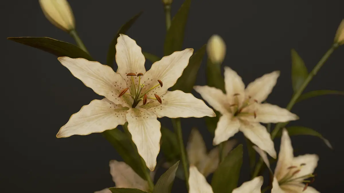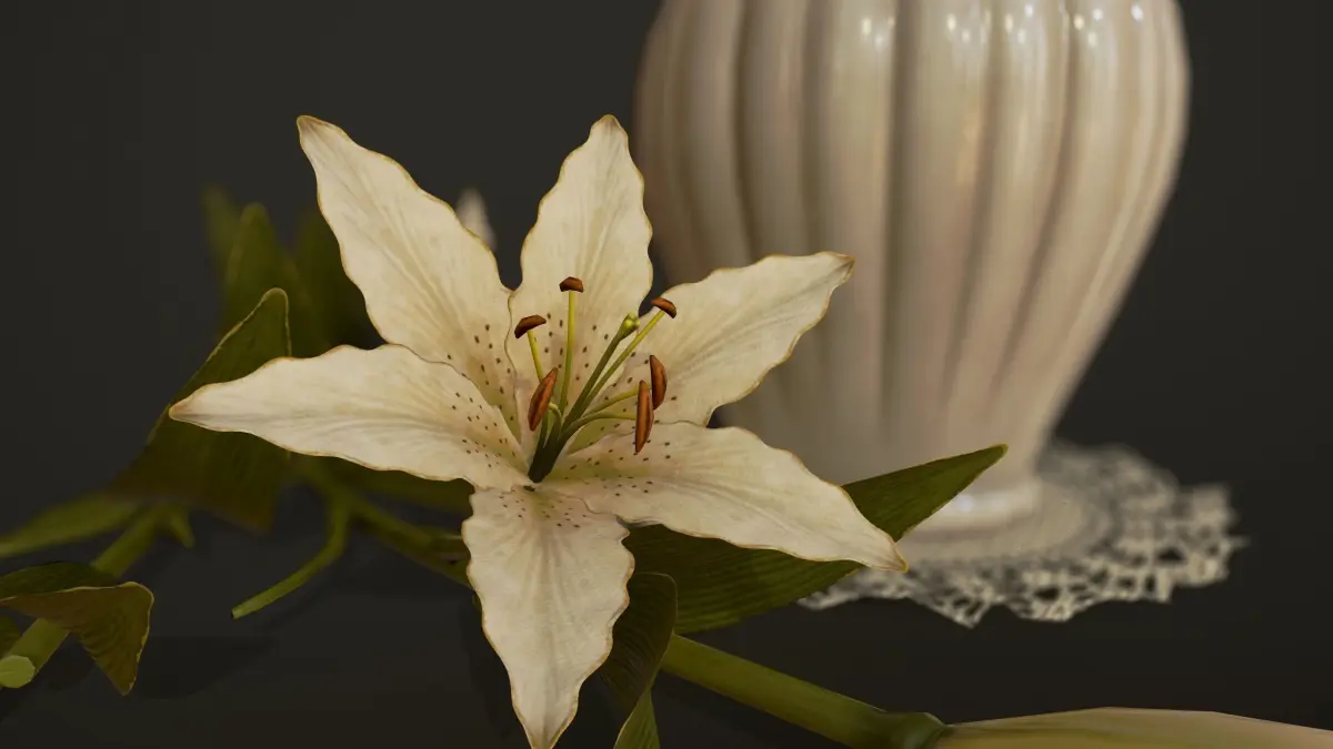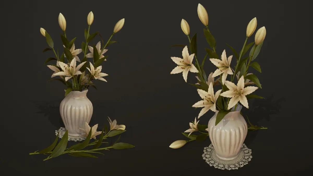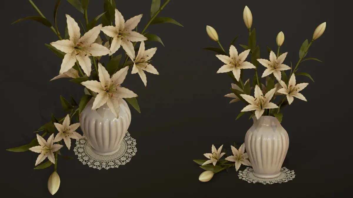 Bouquet with Lilies includes 3 separate objects: vase with flowers, doily and flower branch.