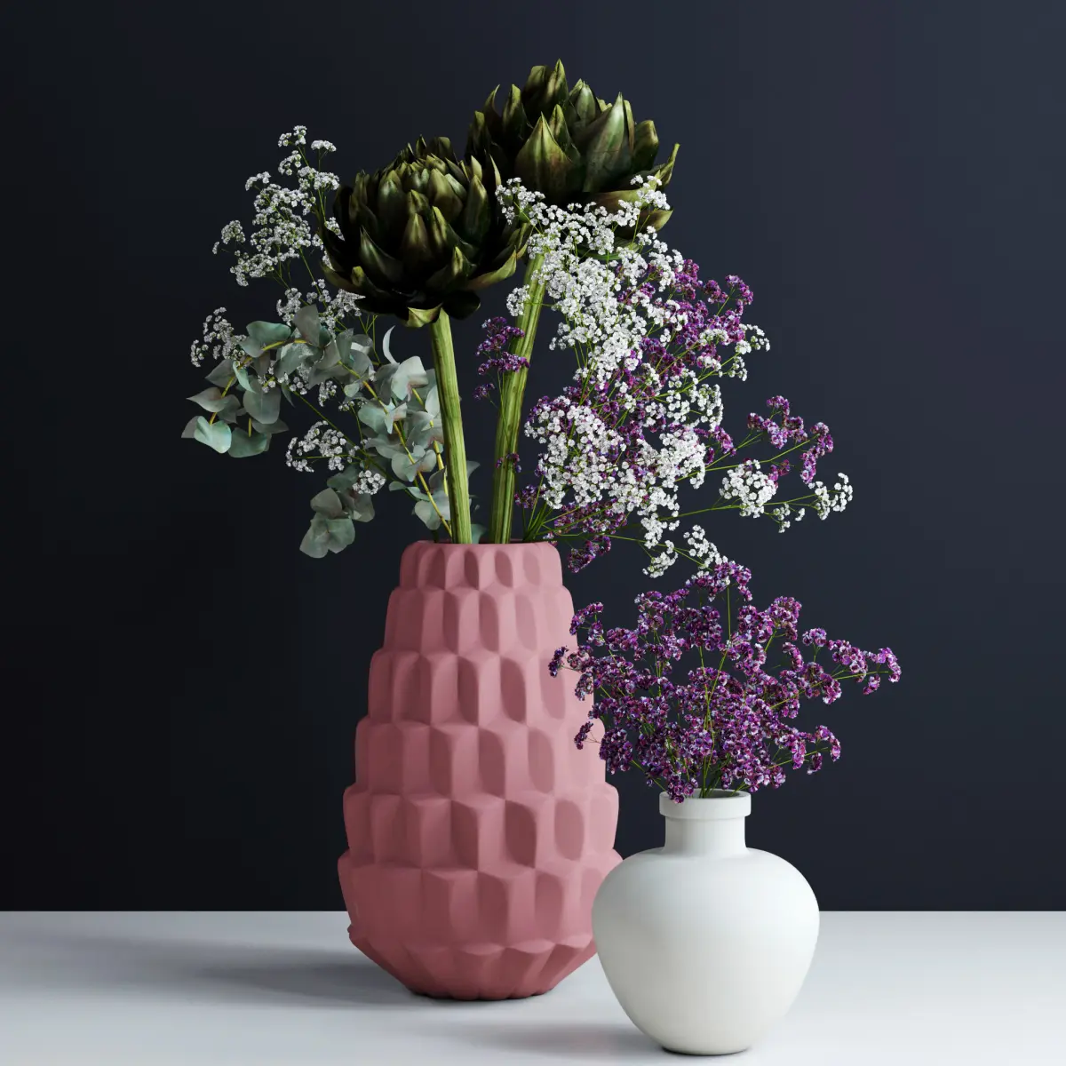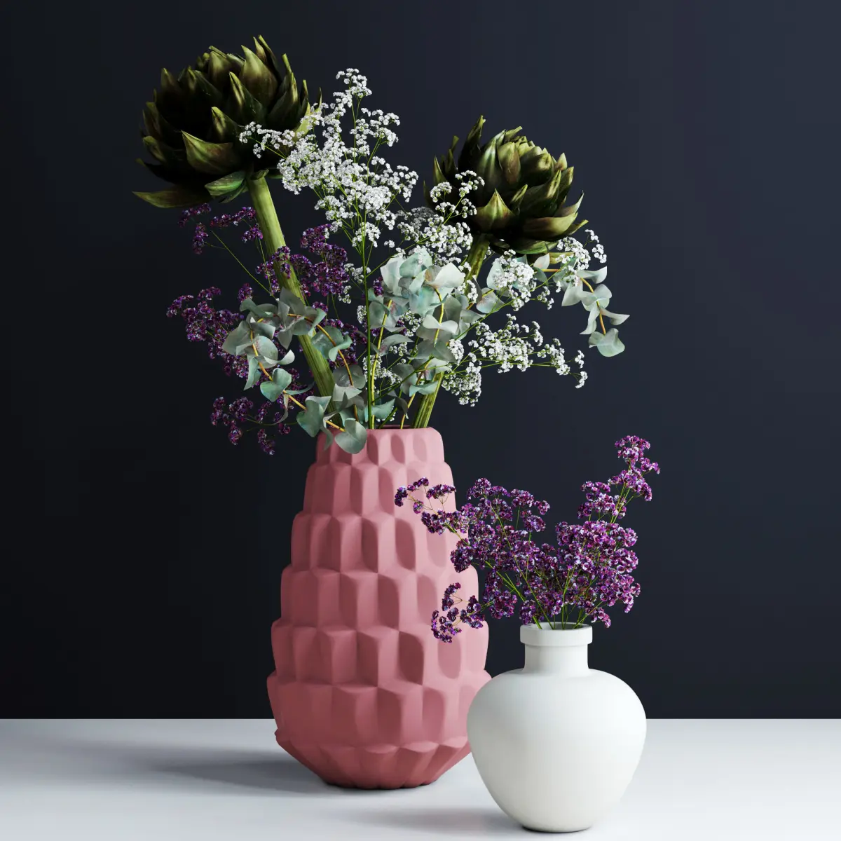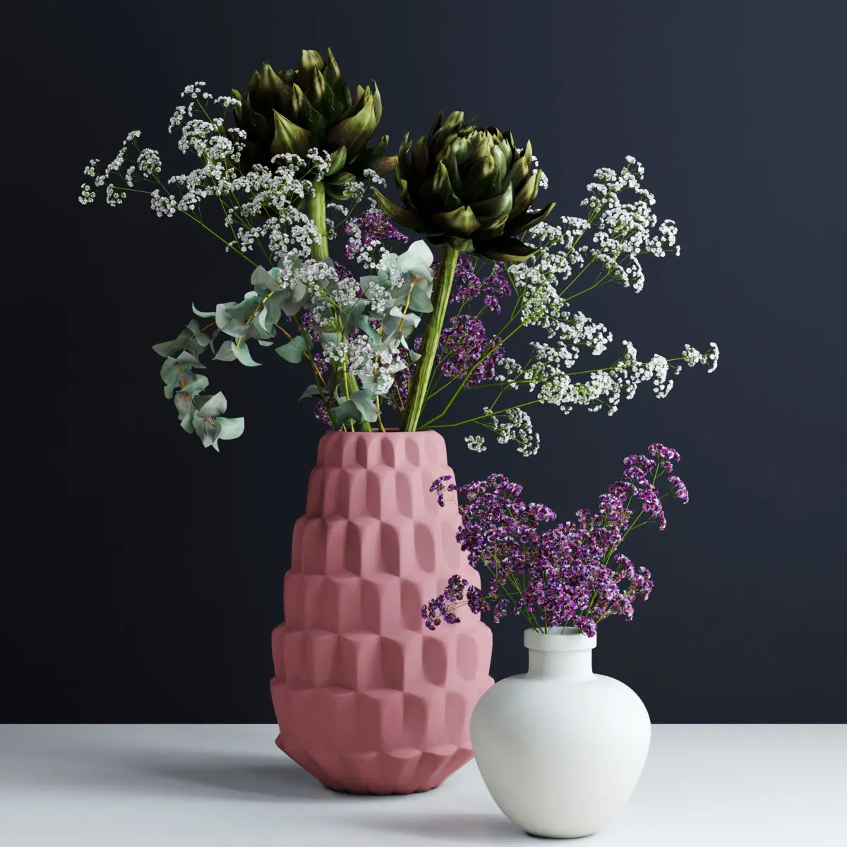 Model consists of:• 2 green artichokes• 3 eucalypsus twigs• 2 white gypsophila twigs• 2 violet gypsophila twigs• Pink ceramic vase• White ceramic vase