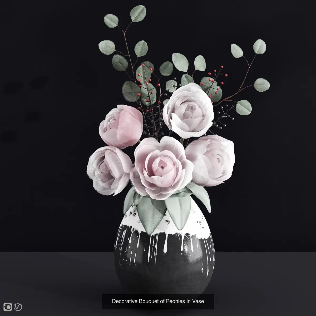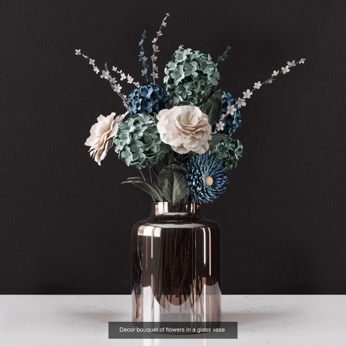 Photorealistic models of delicate bouquets of flowers in vases.