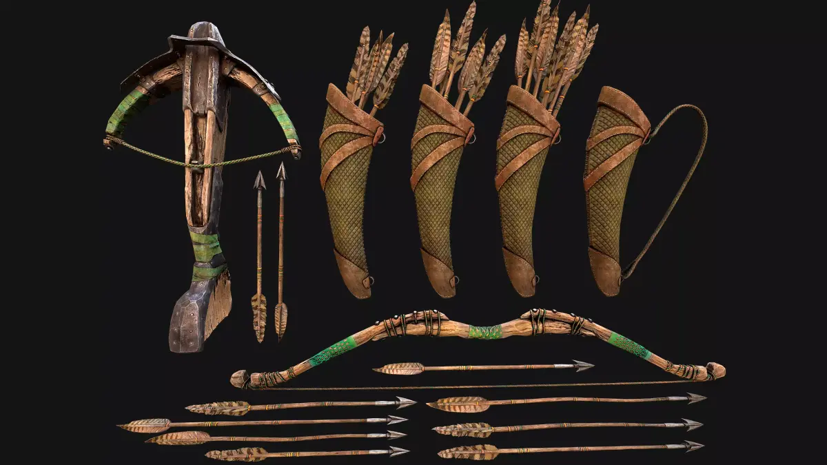 Game ready models .The model contains lods, detailed information on the images.Stylized and detailed Archers Set fully textured, sculpted and rendered with Physical based rendering (PBR) - Shown images have been rendered in Marmoset Toolbag .The set contains 10 models of arrows, a model of an empty quiver, a model of a quiver with 4 arrows, a quiver with 6 arrows, a quiver with 9 arrows and Wooden Bow and Crossbow .The set contains 4 color options.