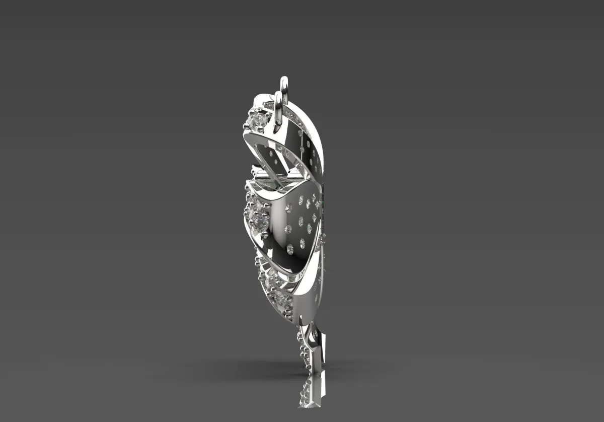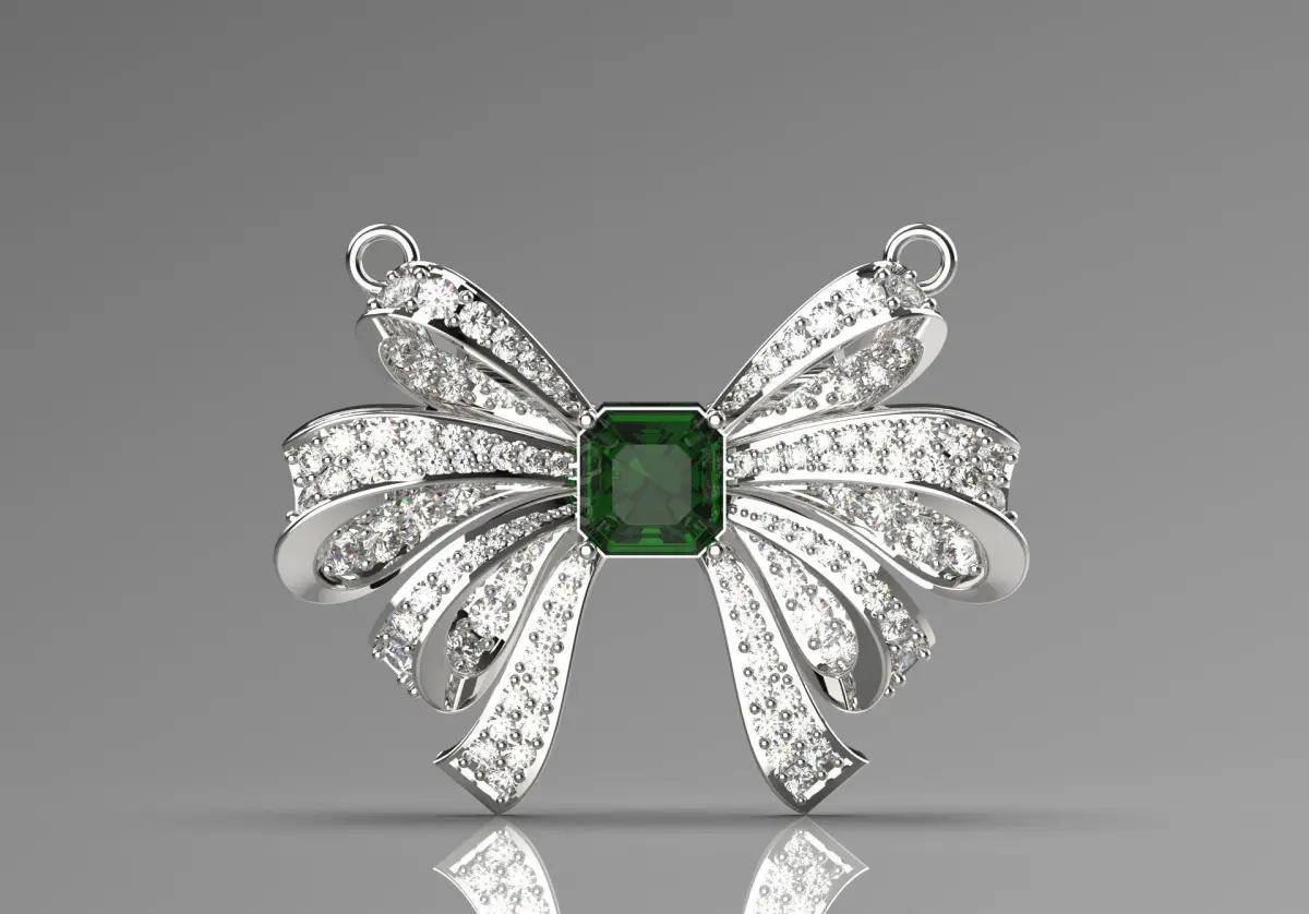 This pendant features a stunning bow design crafted from white gold. At the center, a vibrant emerald-cut gemstone exudes elegance, surrounded by intricately designed ribbon-like elements adorned with numerous sparkling round stones, diamonds. The ribbons twist and curve beautifully, creating a dynamic, sinuous shape. The interplay of the dark emerald green stone with the sparkling diamonds adds luxurious contrast, making it a striking piece suitable for both formal and informal occasions. The design exudes both sophistication and playful charm, perfect to enhance any jewelry collection.