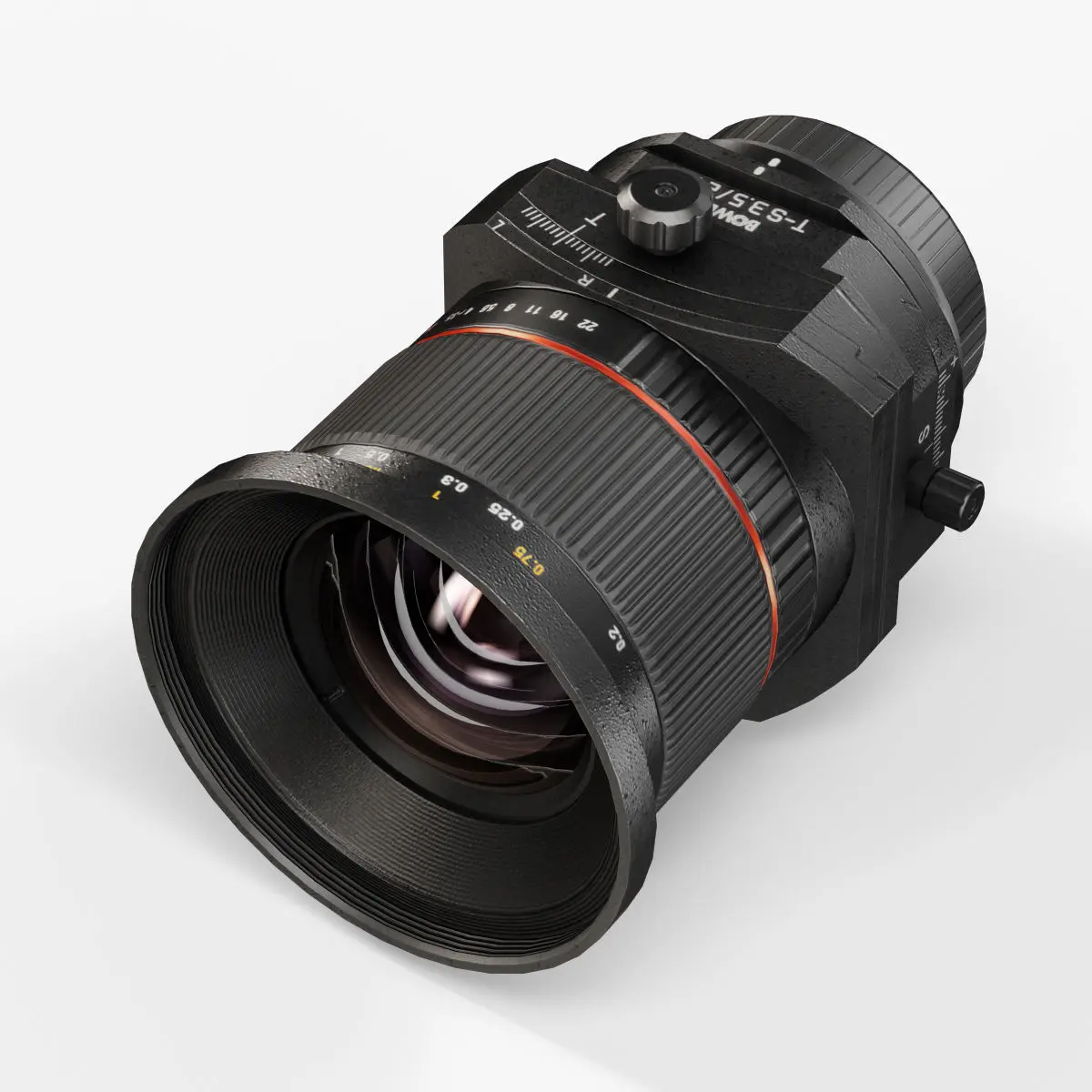 • Let me present to you high-quality low-poly 3D model Bower 24mm f/3.5 ED AS UMC Tilt-Shift Lens (Canon EF Mount). This model can be used in various fields 3D Graphics such as game development, advertising, interior design, motion picture art, visualization, etc... Modeling was made with ortho-photos of real lens that is why all details of design are recreated most authentically.