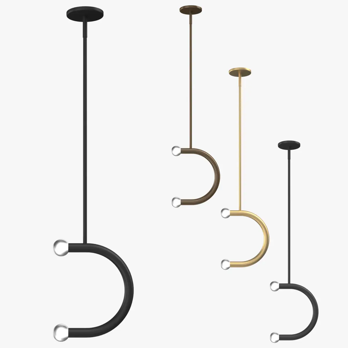 Double Pendant C LightsThe Double Pendant C Lights are made from brass tubing capped with blown satin glass globes. The tubes curve around one another and align at their glowing orbs, creating drama and tension.