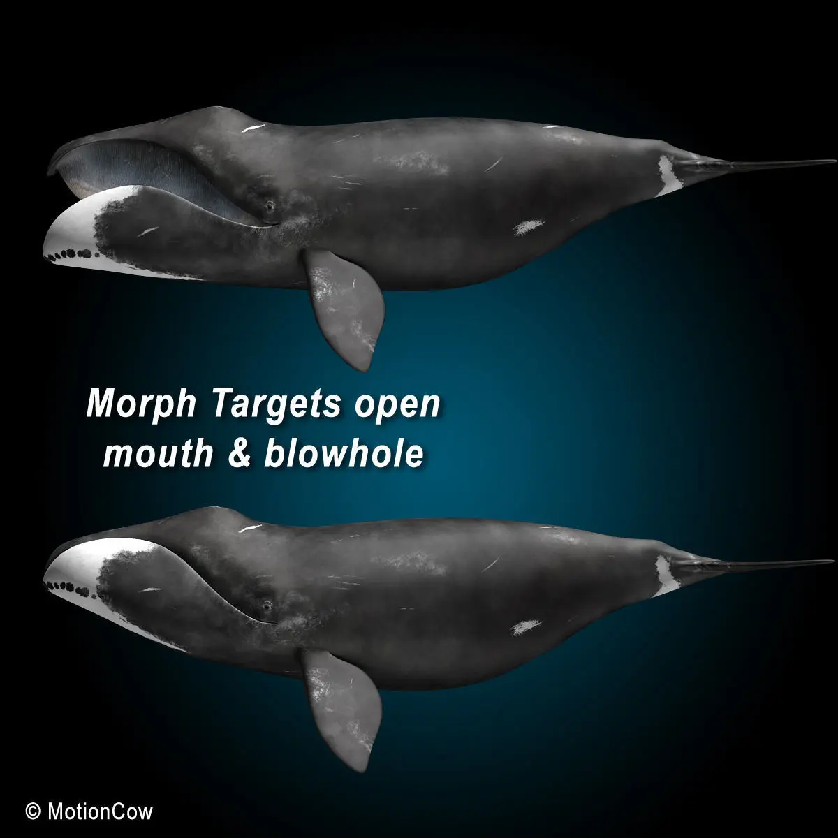 - Mouth, eyes and blowhole opening controlled by morph targets, set-up appropriately in all 3D applications.