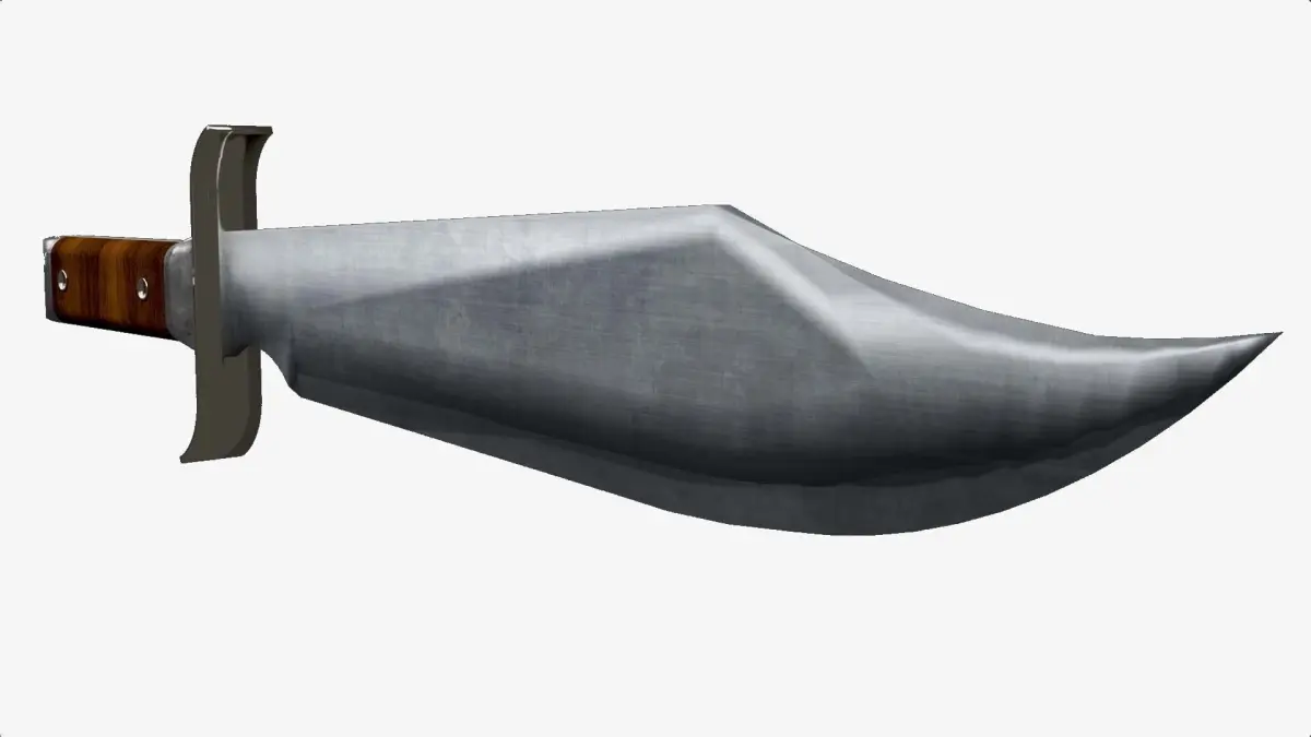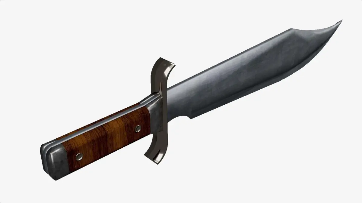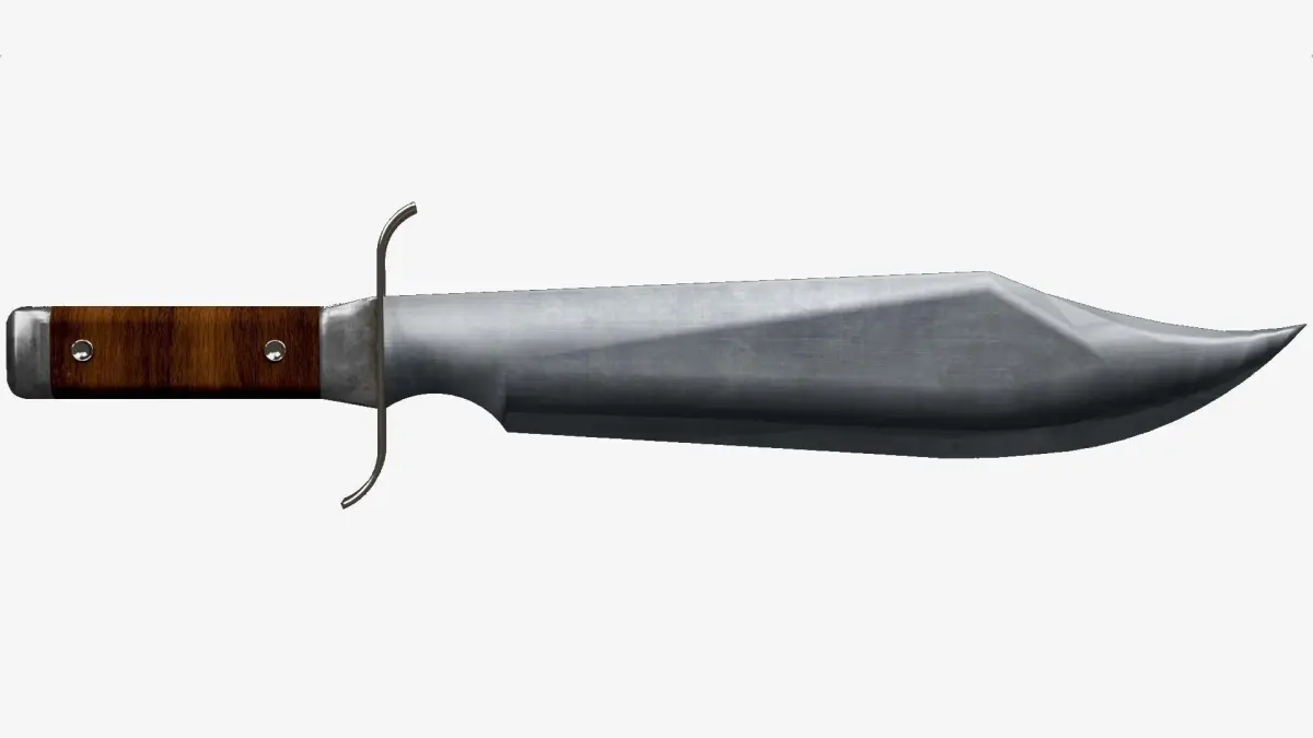 Forma general: El cuchillo Bowie tiene una hoja robusta y ancha con un diseño distintivo, que se estrecha hacia la punta. Tiene una guarda que protege la mano del usuario durante el uso. El mango suele ser ergonómico para un agarre cómodo. Está hecho de madera y metal. El pomo es sólido, diseñado para funciones específicas, como romper vidrio en situaciones de emergencia. Longitud total: 44 cm La longitud total del cuchillo Bowie puede variar, pero generalmente es de tamaño medio a grande. Texturas y materiales: el aspecto del acero pulido en la hoja y la textura del mango.