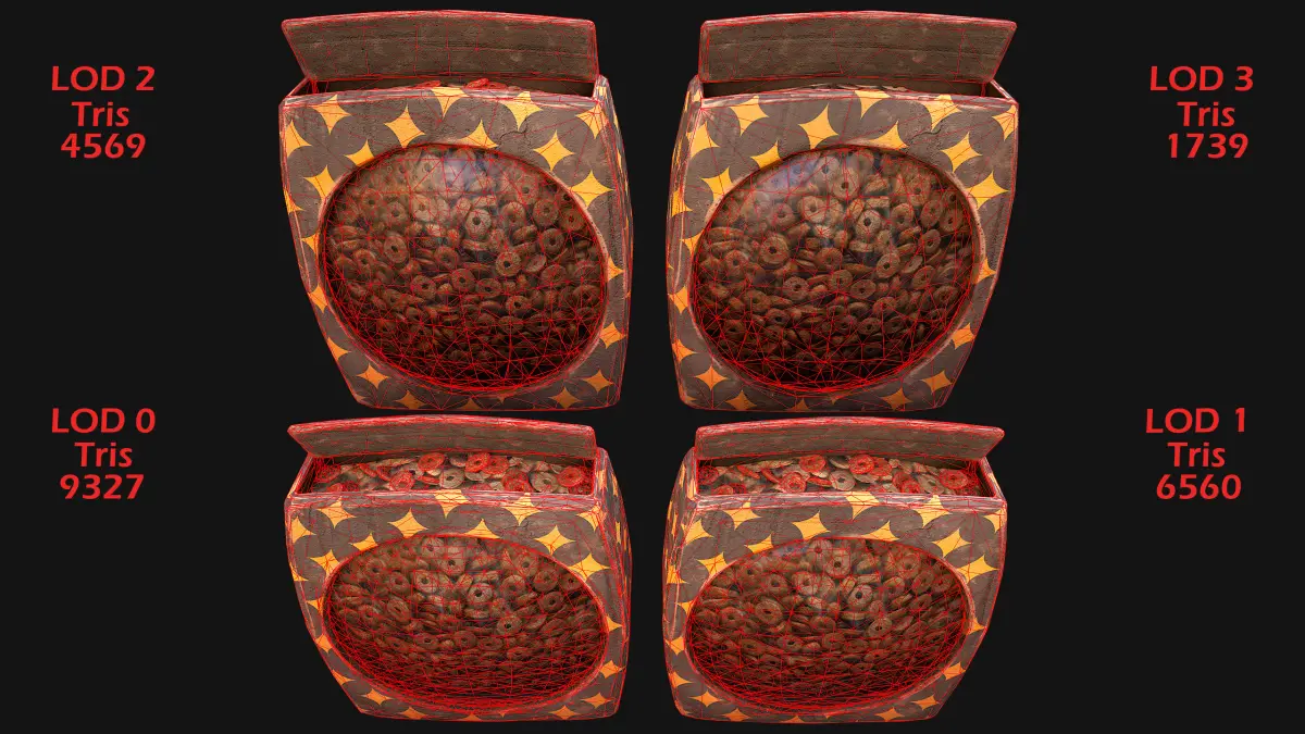 - Edges: 14227(LOD0),10041(LOD1),7018(LOD2),2694(LOD3).