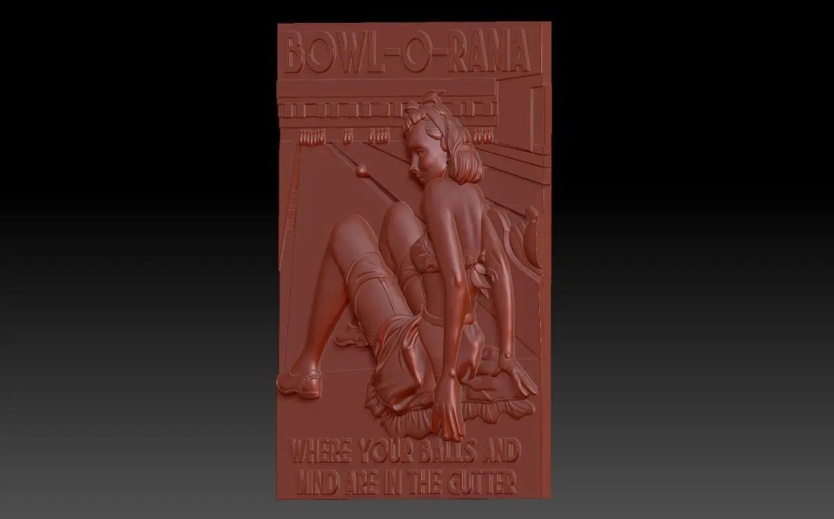 A 3D model of a bas-relief depicting a girl playing bowling. The work is suitable for 3D printing and CNC machine tools.
