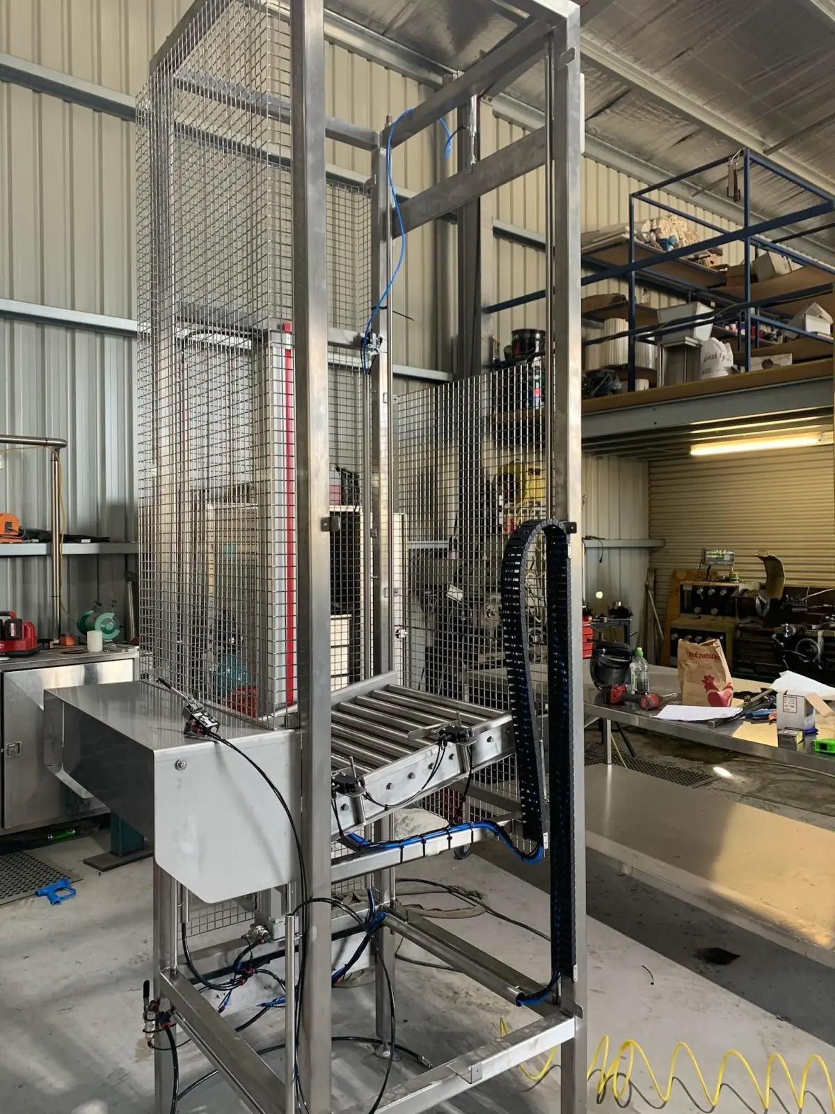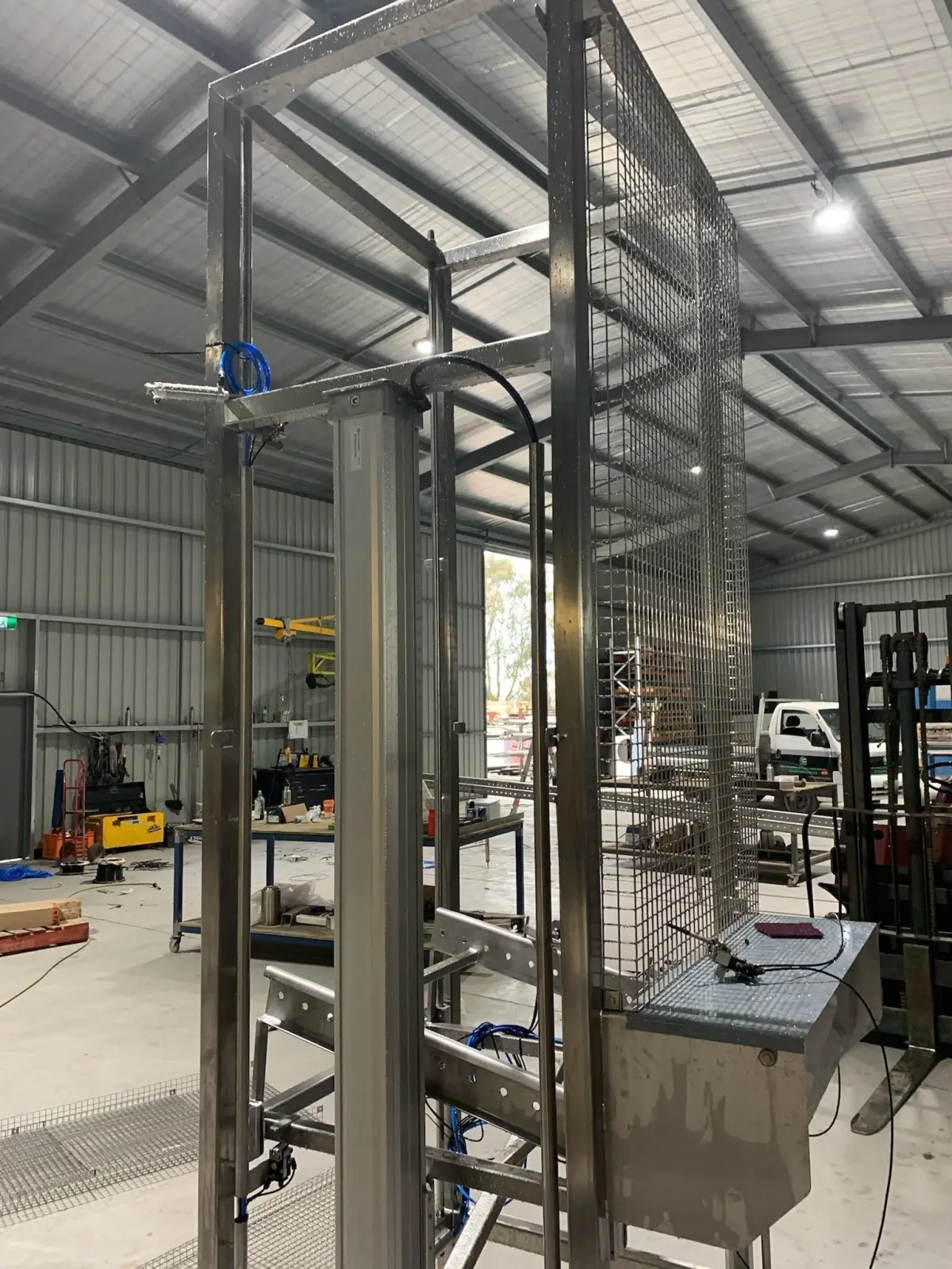 Meat Box Lifter modeled from images and provided dimensions . A pneumatic actuator is used to move the carriage up and down. The model was made in SolidWorks 2016.