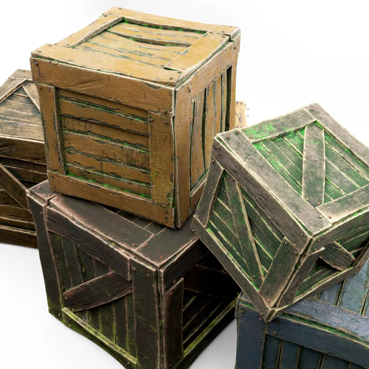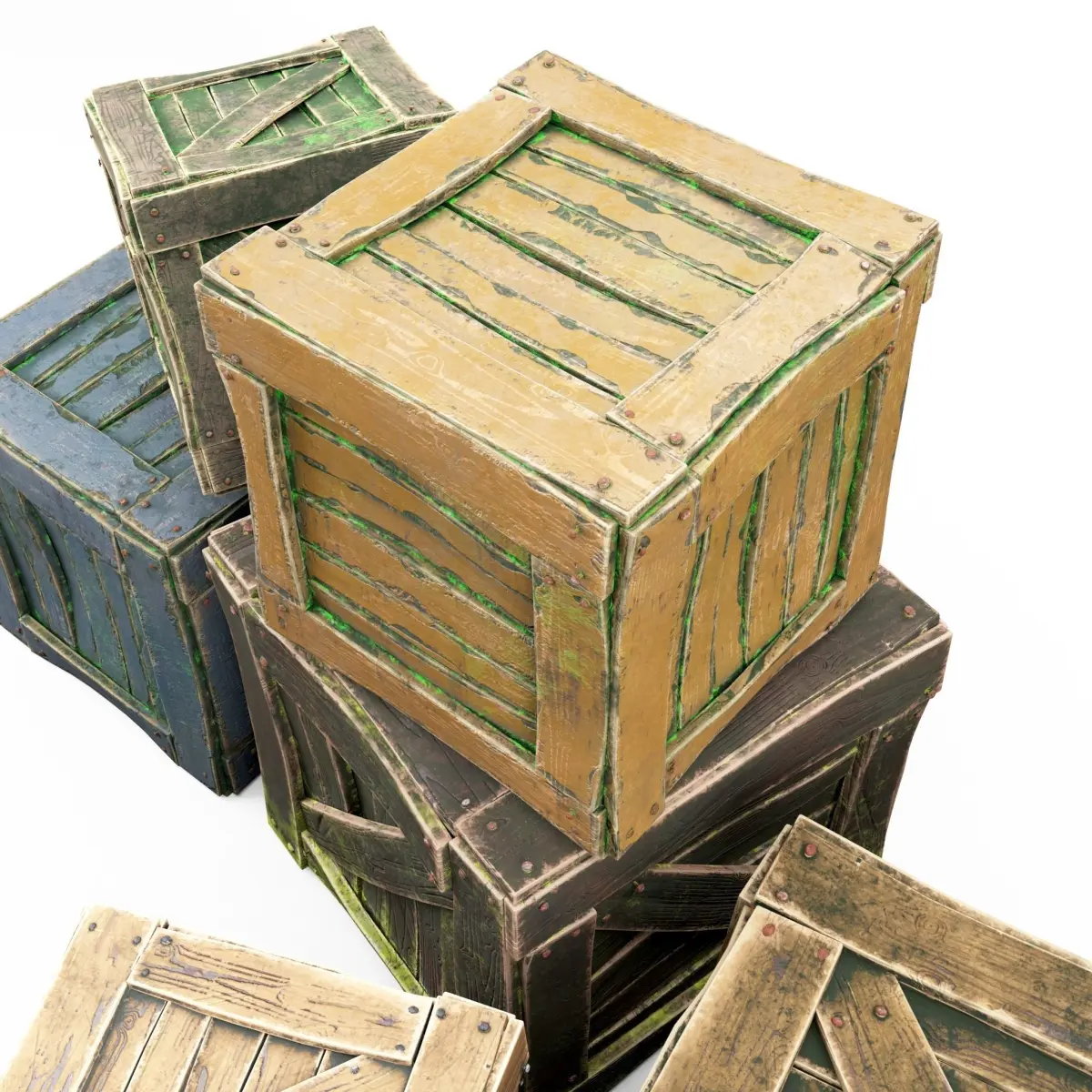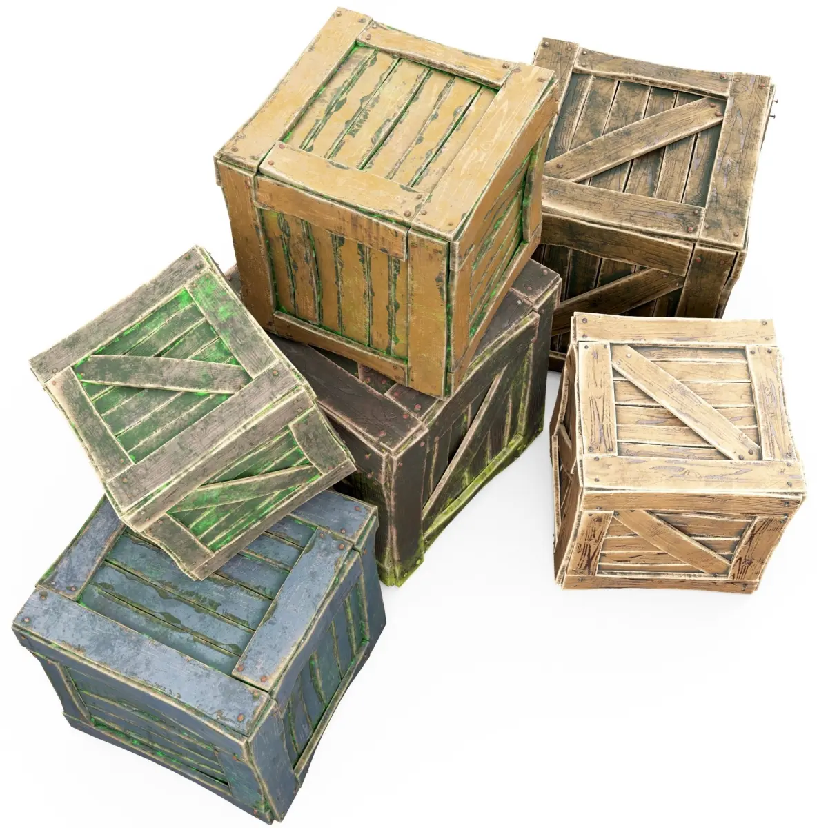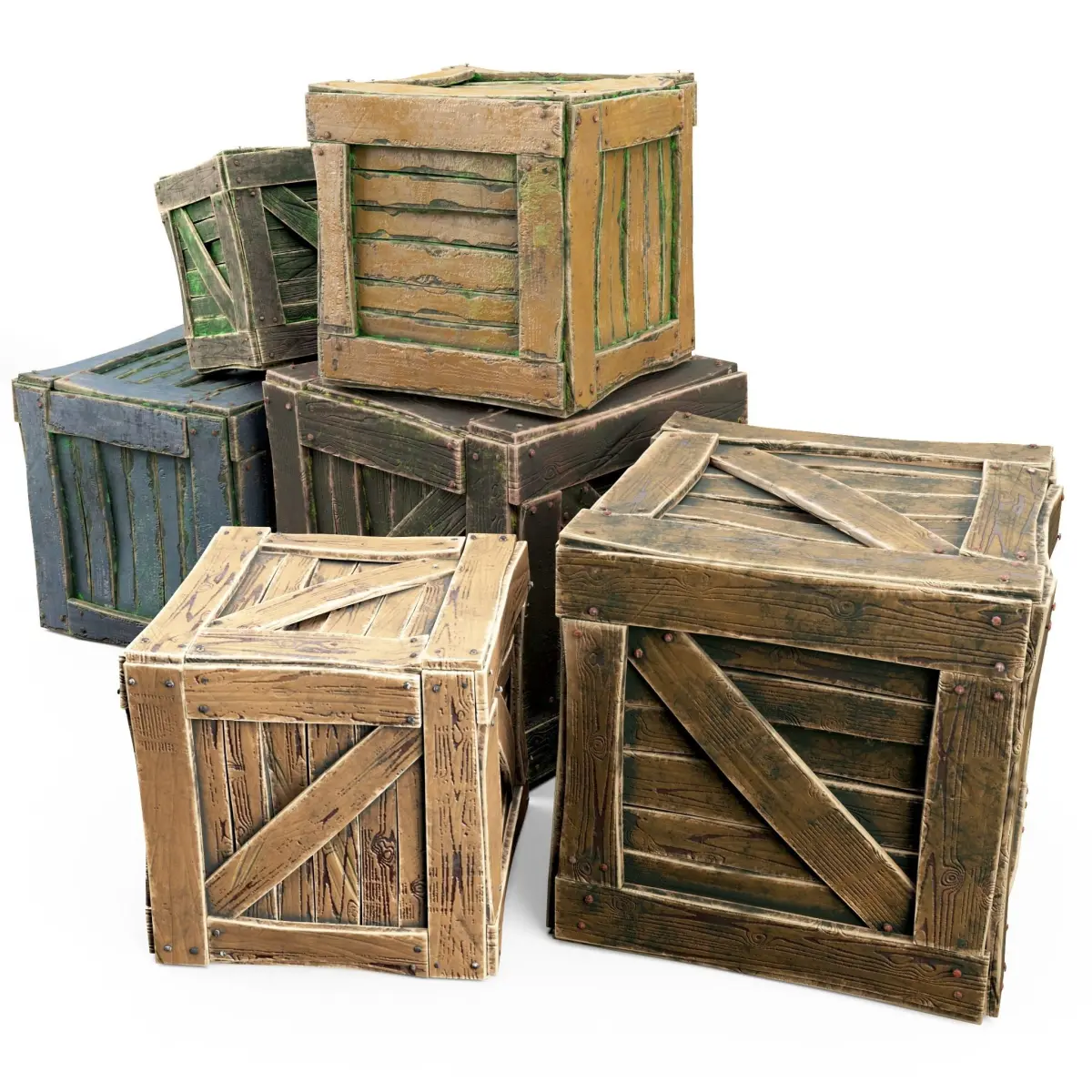 Pack of 6 3d models of box wooden crate cartoon pack.