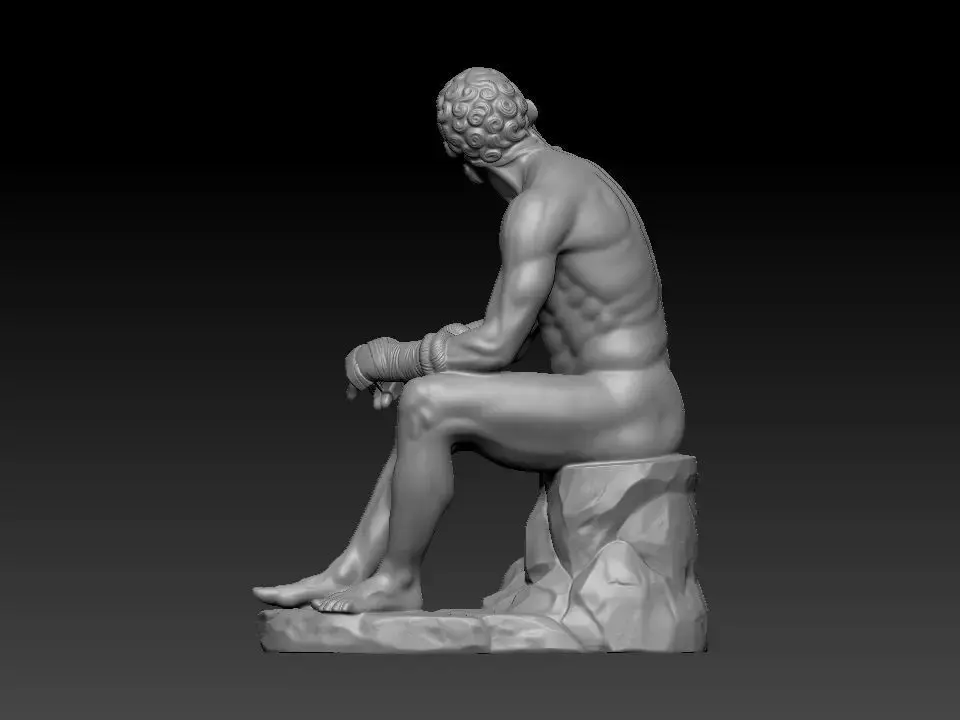 This high-poly asset is a definitive digital recreation of the Boxer at Rest (Terme Boxer), the celebrated Hellenistic Greek masterpiece. The sculpture captures the raw, visceral reality of ancient athletics—depicting a veteran pugilist in a moment of exhaustion. Every anatomical detail is meticulously preserved, from the cauliflower ears and scarred facial features to the intricate leather hand-wraps (caestus). This master-mesh serves as a museum-quality study of psychological realism and classical bronze aesthetics, ideal for historical archiving and high-end collectibles.