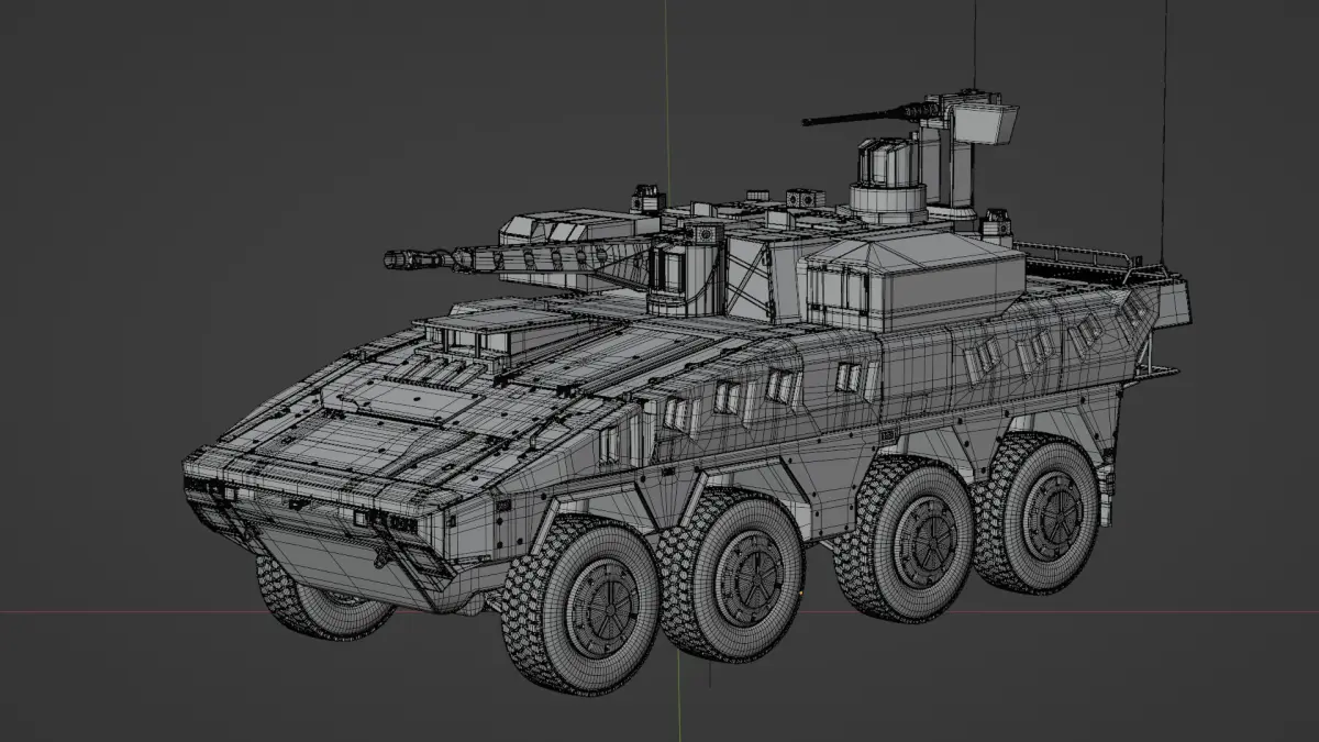 Highly detailed 3D model of the Boxer MRAV (Multi-Role Armoured Vehicle). This high-poly model features accurate geometry, realistic camouflage textures, and non-overlapping UVs. Ideal for military visualizations, animations, and high-quality renders. Model includes textures and materials, but is not rigged or animated.