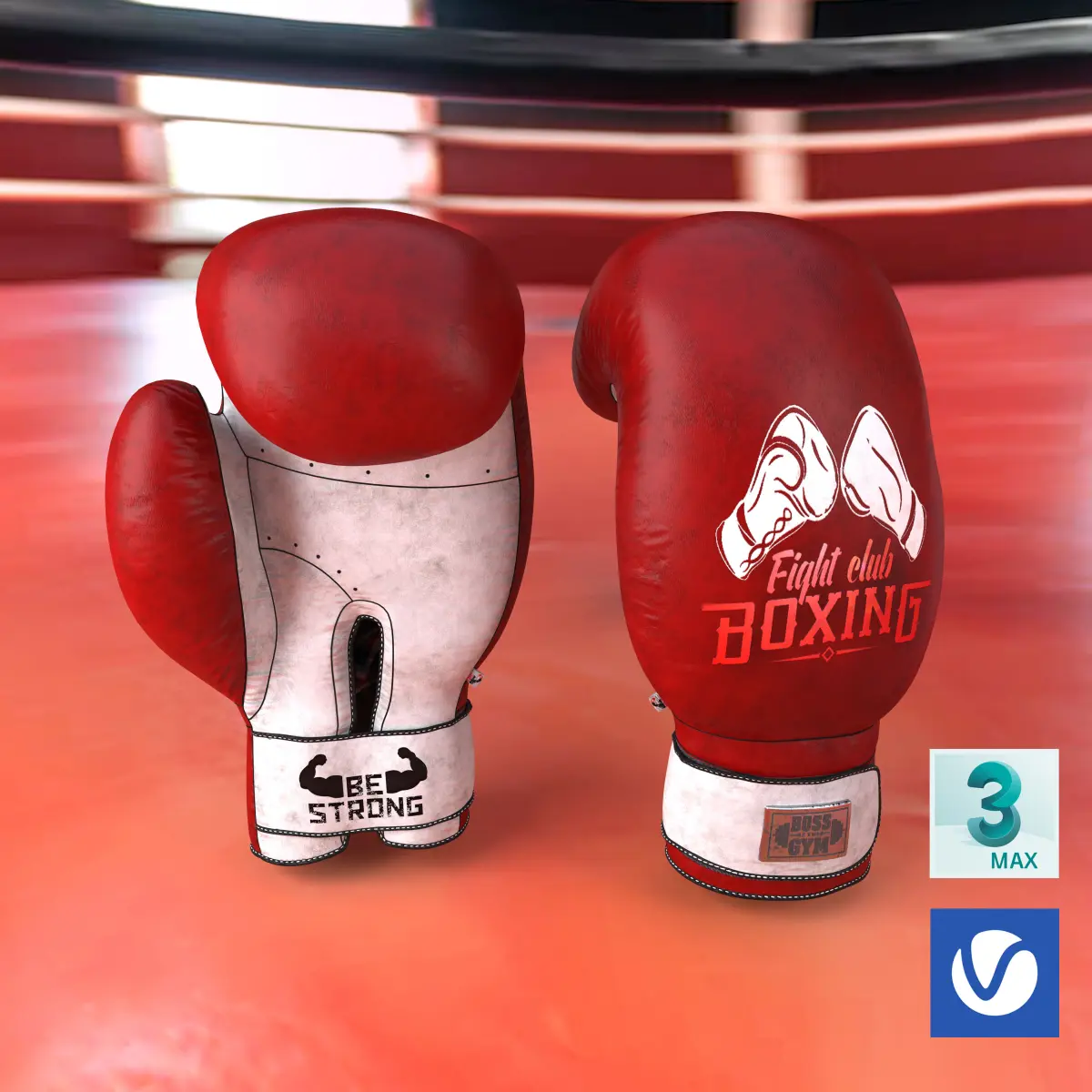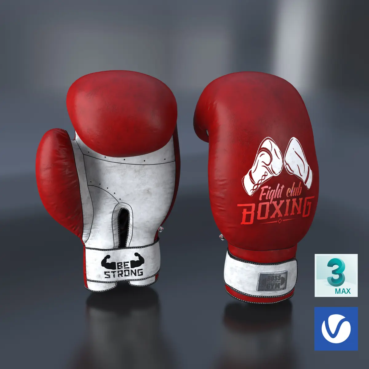 Boxing gloves are made in a standard style, consisting of leather and metal textures. The lot for sale has a model with 3 types of coloring for greater possibilities of use in your projects.