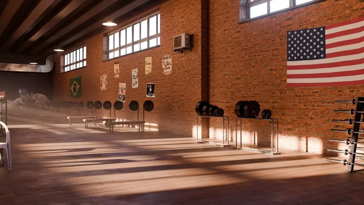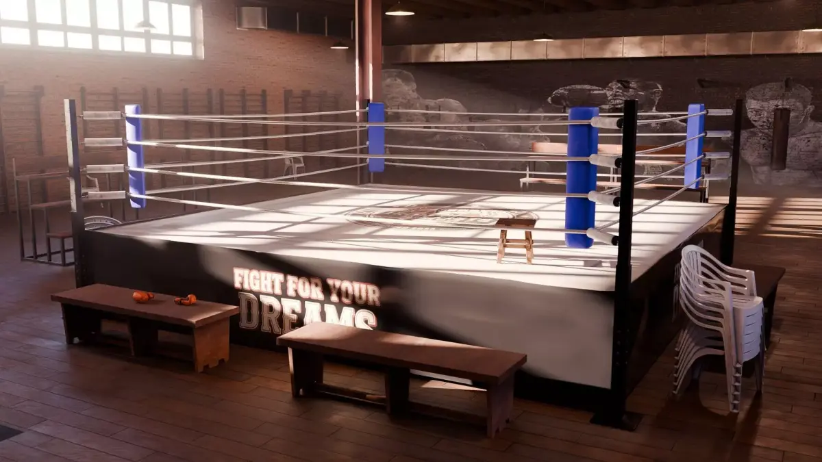 Complete boxing gym setup, including a full-size ring, heavy bags, speed bags, weightlifting benches, stools, and various gym props.High-quality 2K textures, most of which were created using Substance Painter, ensuring realistic materials and a polished professional look.Carefully crafted lighting, featuring natural sunlight entering through the windows and a subtle volumetric fog effect enclosed within a dedicated cube.Stylized mural walls and industrial-style details that capture the atmosphere of a classic, old-school boxing facility.