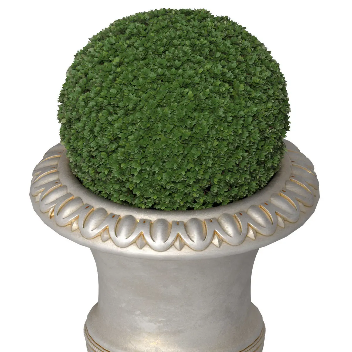Boxwood in a classic vase for facade decoration in light stone. A stone planter will fit perfectly into any classic exterior.Magnificent Garden Decoration in Baroque Style
