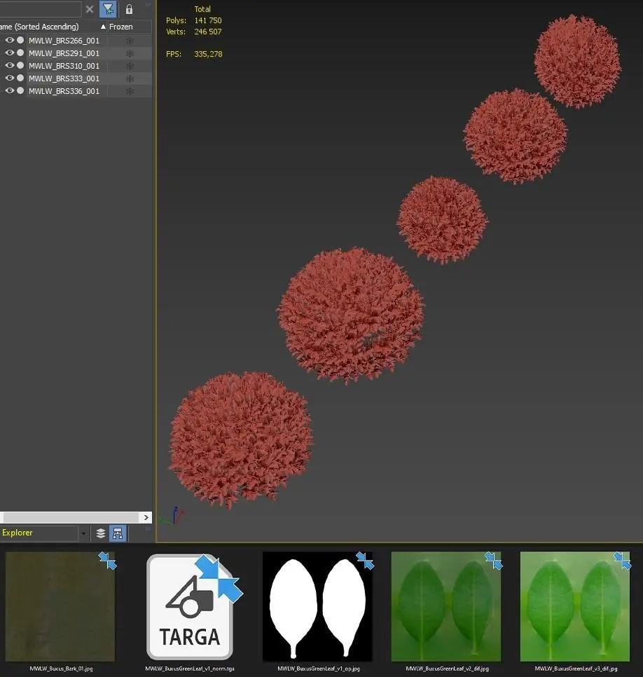 - diffuse maps for leaves, var. 1, 2 - jpg., 512x512; for bark - jpg., 2048x2048