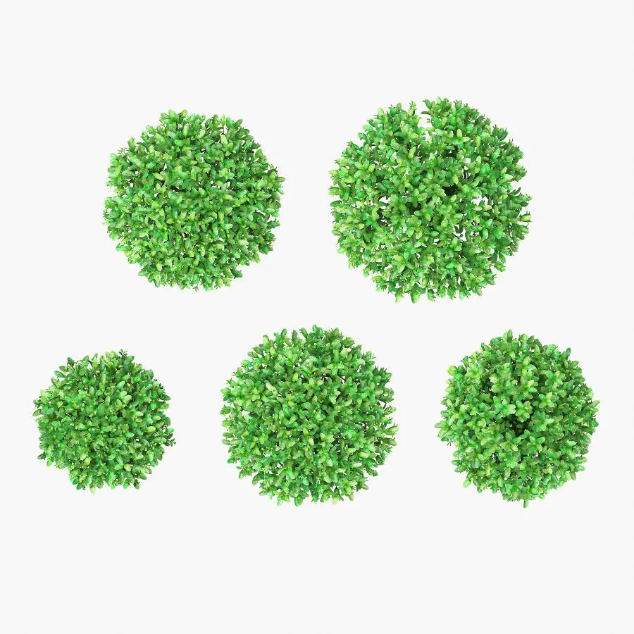 Five small round-shaped buxus (boxwood, european box, common box, buxus sempervirens, american boxwood, common boxwood) bushes 26 - 34cm high. Buxus is evergreen and very hardy and can be shaped into any form. For gardeners who enjoy ordered and very neat growth without having to do too much maintenance, this plant has become a favourite for containers, low hedges and other topiary.
