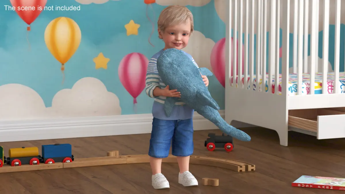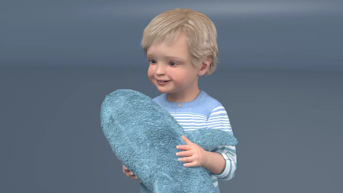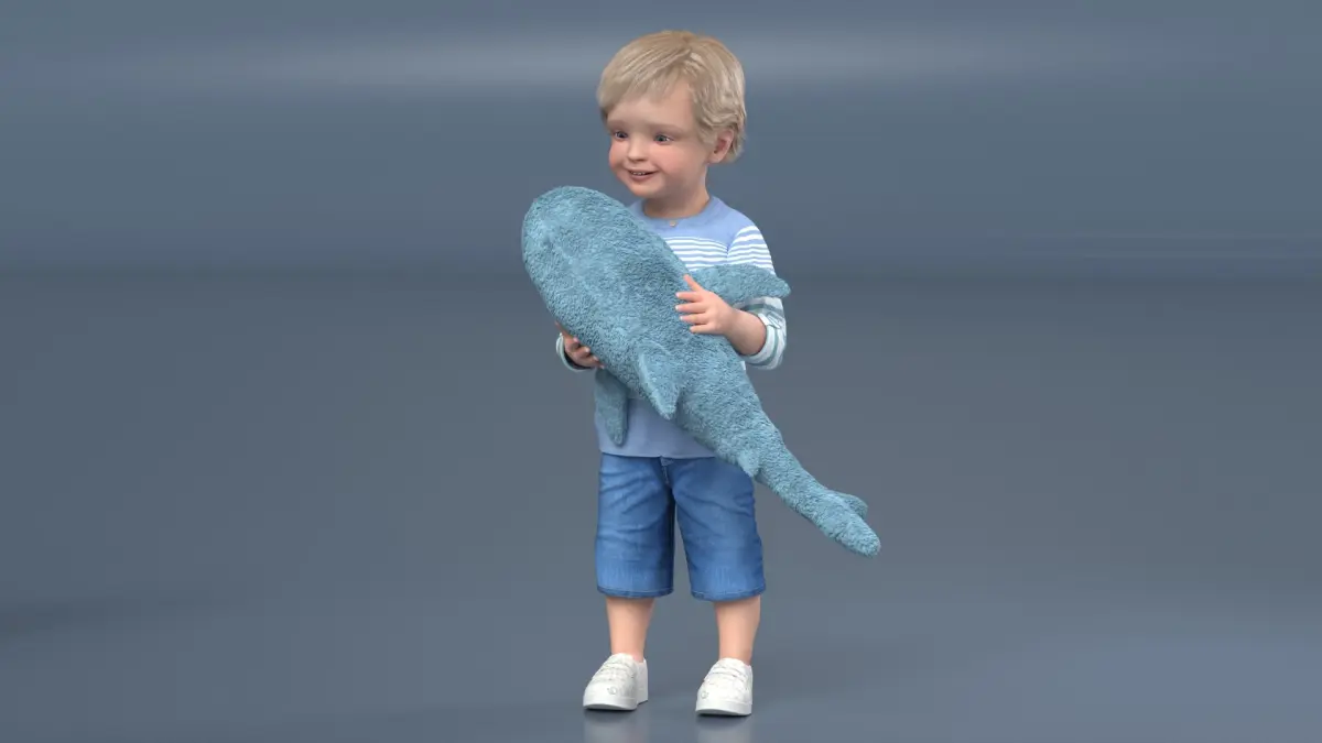 Boy Holding IKEA Stuffed Shark Toy Fur is a three-dimensional model of little boy who hugging a toy shark baby (plush stuffed toy that resemble a baby shark).