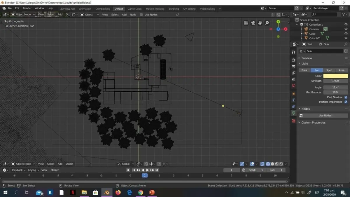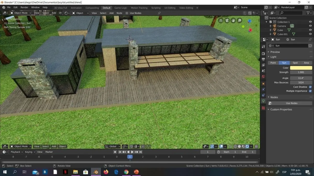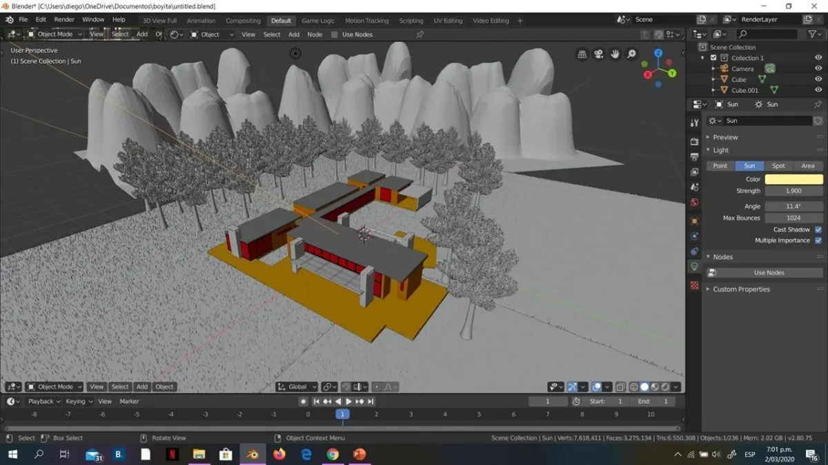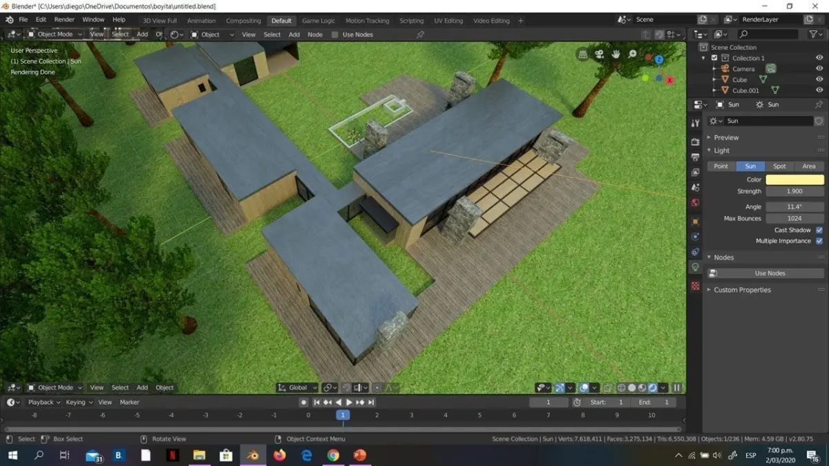 This is the 3D exterior model form a house into the woods, this house has an modern architecture with woods colors, this model was made in blender v2.82, it also has some trees that decorates the 3D enviroment.