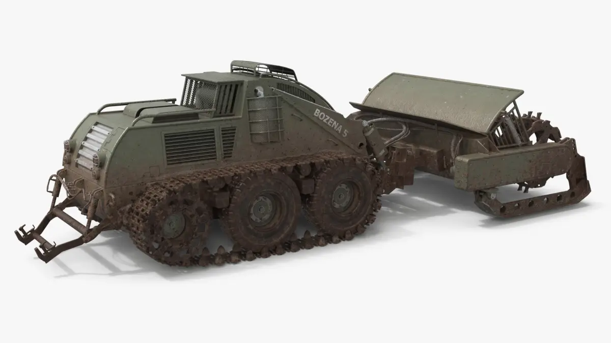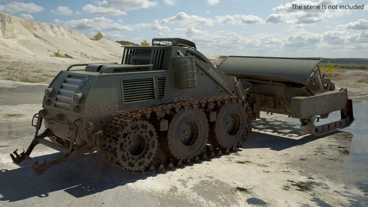 Bozena 5 Remote Mine Clearance Vehicle Military Green Used is a high quality, photo real 3d model that will enhance detail and realism to any of your rendering projects. The model has a fully textured, detailed design that allows for close-up renders, and was originally modeled in 3ds Max 2020 and rendered with V-Ray. Renders have no postprocessing!