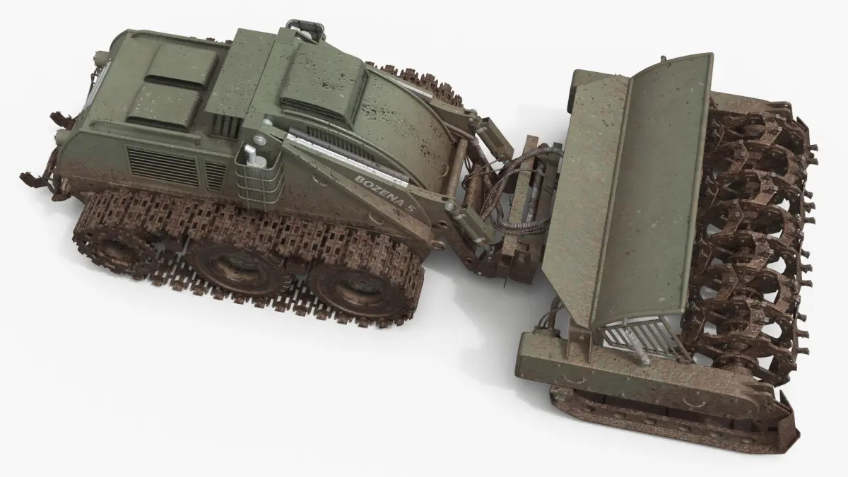 Bozena 5 Remote Mine Clearance Vehicle Military Green Used is a three-dimensional model of a heavy-duty unmanned demining system, designed to replicate a field-worn version of the real vehicle with visible signs of use, weathering, and battlefield wear.