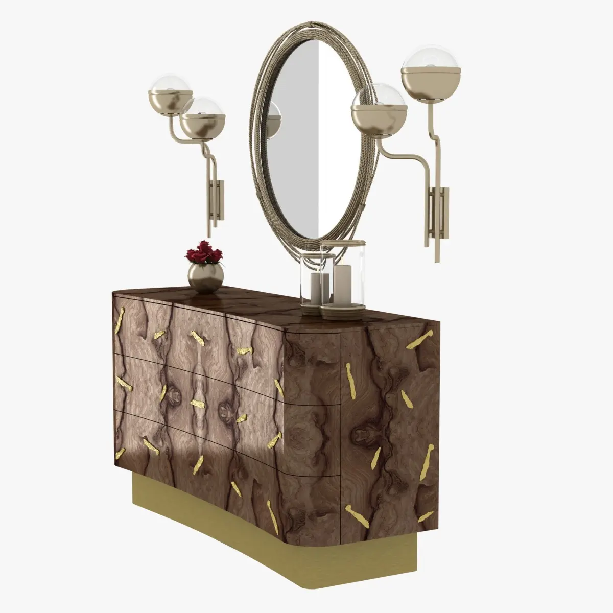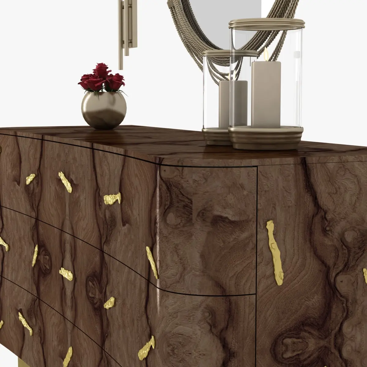 baraka wooden chestOut of stockW 240 cm | 94.5D 50 cm | 19.7H 82 cm | 32.3"Baraka is an ancient Sufi world which means ''a blessing or as the breath, or essence of life'' from which the evolutionary process unfolds, and also that is believed to be possessed by certain persons and objects. The spirit or BARAKA inspired the creation of a cupboard that uses no language because its design speaks magnificent images of natural beauty. Charismatic by its never ending contrasts between ancient and contemporary lines, BARAKA Cupboard body's half brightness combines walnut root veneer with brass details, an interior in bird eye wood veneer and the base in vintage matte brass. This exquisite design piece that stands out outside of historical time will enhance the beauty of Baraka energy into your modern living room set.
