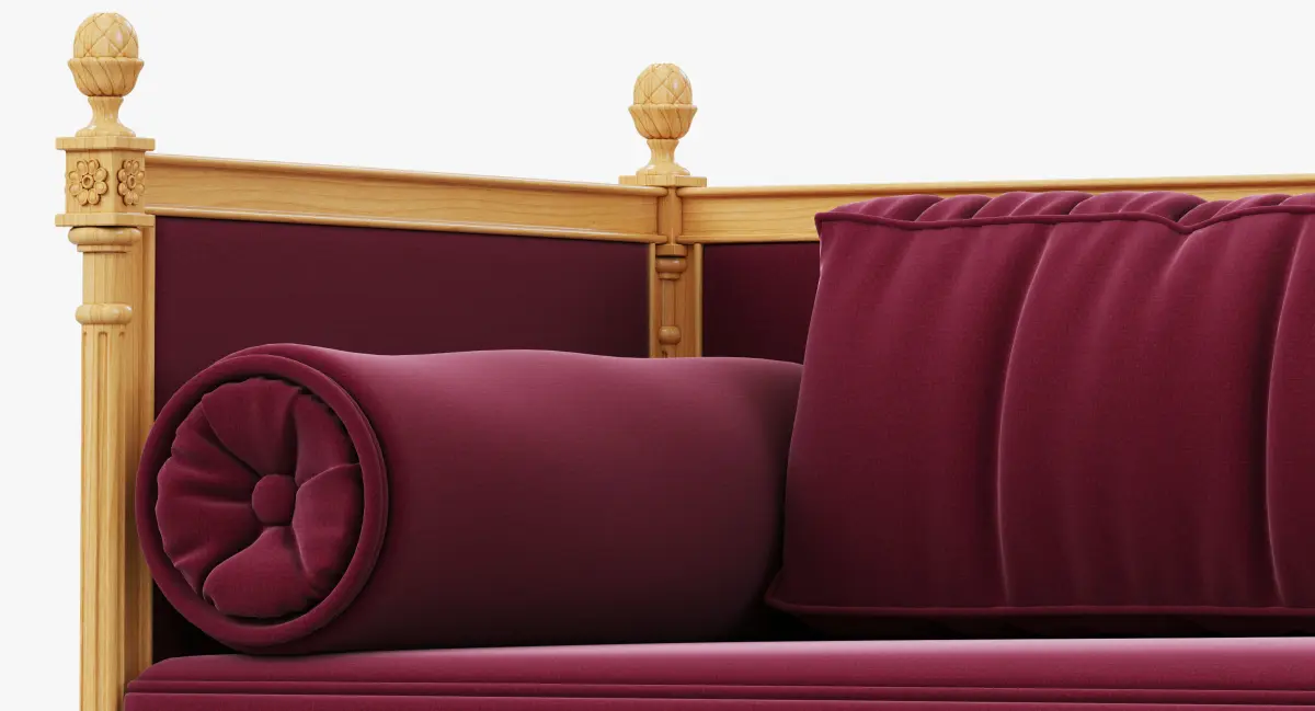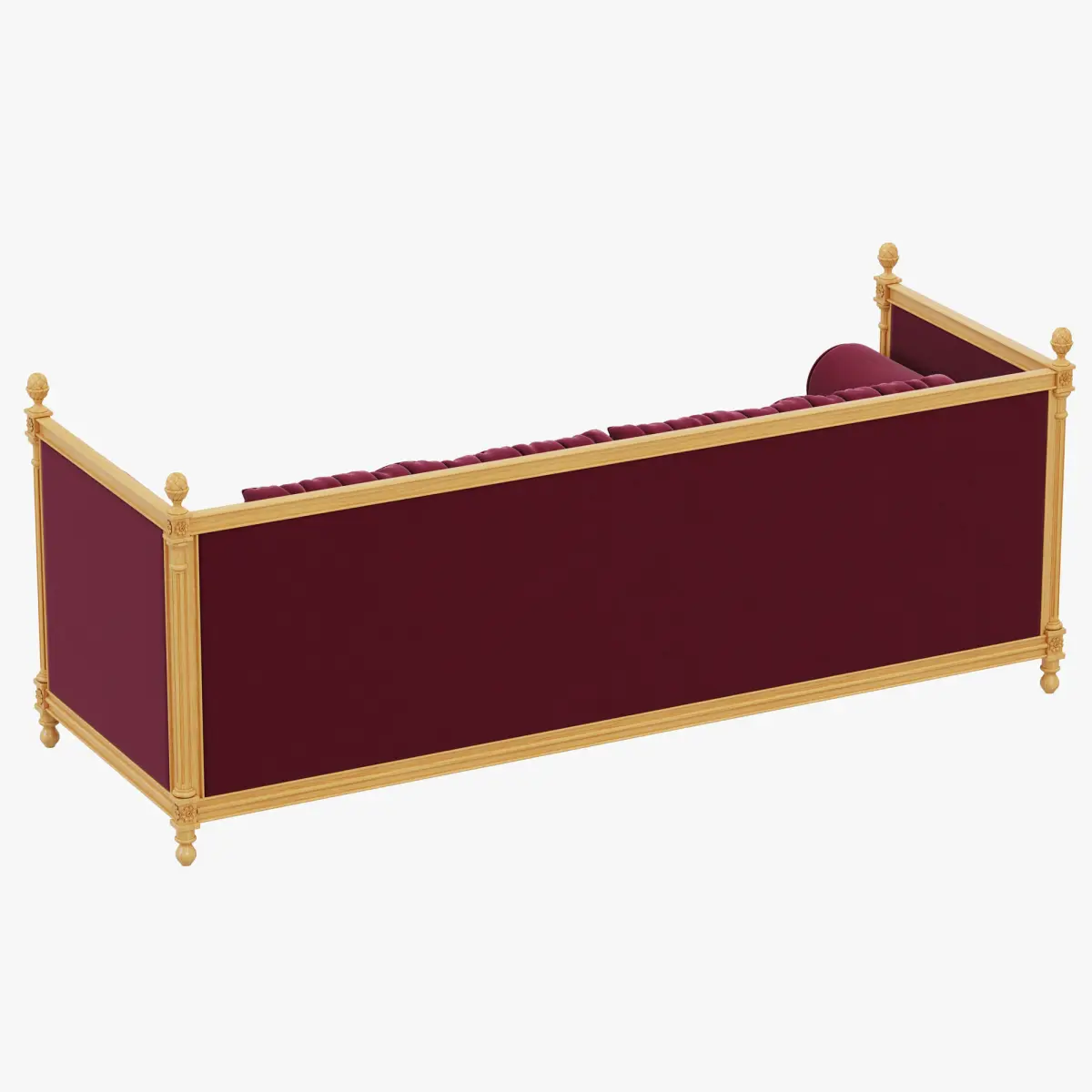 MALKIY sofa was named after a king and priest mentioned in the Book of Genesis whose name, according to ancient interpretations, means justice and king of righteousness. These concepts of fairness and integrity are imbued in MALKIY, a classic and geometric sofa upholstered in maroon cotton velvet. The straight lines of MALKIY sofa structure in golden leaf contrast with the softness of the maroon cotton velvet cushions and pillows. The golden structure is enriched by natural motifs, carved in the wood to emphasize the idea of rectitude and honesty. MALKIE sofa fits well in every classic ambience, either in residential project like living rooms or in public projects like hotel lobbies or hotel suites. MALKIY sofa is available in other colours and fabrics and can be upholstered in COM and COL.