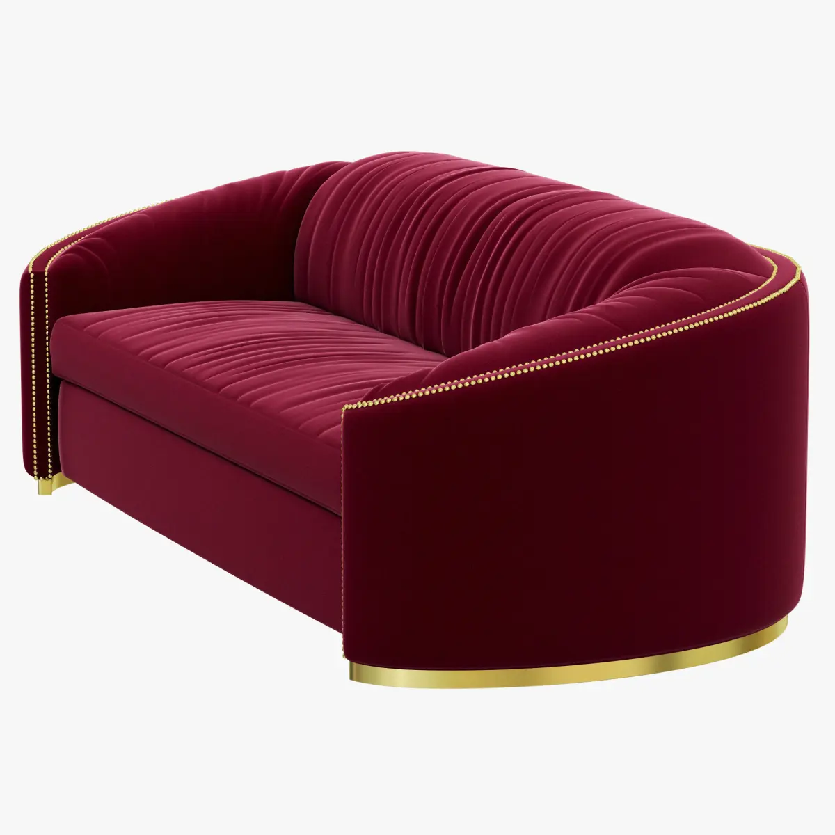 Some of the most impressive monuments of the Middle Ages, the medieval castles, can be found in Wales, often called the 'Land of Castles'. These private fortified residences were both offensive and defensive structures which provided control of the area immediately surrounding them. WALES sofa was designed to provide the same feeling of protection: a burgundy velvet sofa, with curvy back and arms, base in aged brass and polished golden nails. Designed to create a complete look for your living room, WALES sofa will be the comfort fortress of your space.