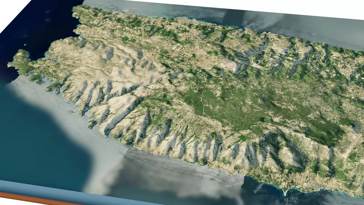 Brac island 3D model terrain. 3d model island of Brac, Croatia and with its landscape of mountains, beaches and forests.