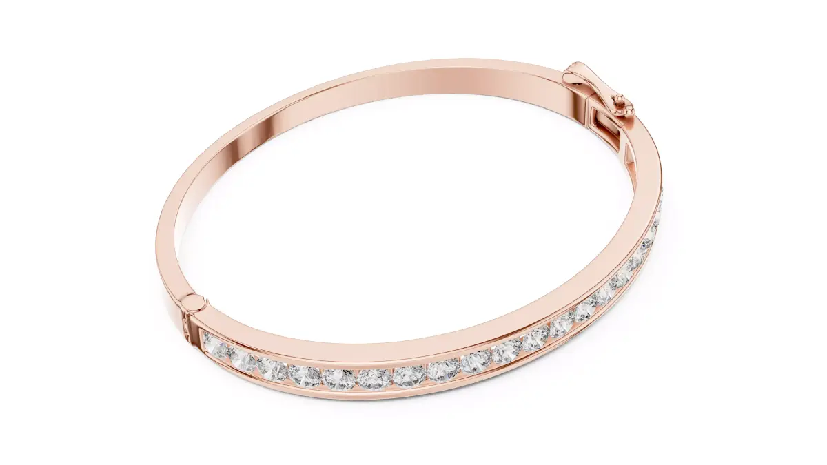 This sophisticated bracelet features a modern, streamlined design with a sleek channel setting. Encased within the polished metal is a row of brilliant-cut diamonds that offer a continuous, shimmering effect. Its secure clasp and smooth finish make it a versatile statement piece for both daily elegance and special occasions.
