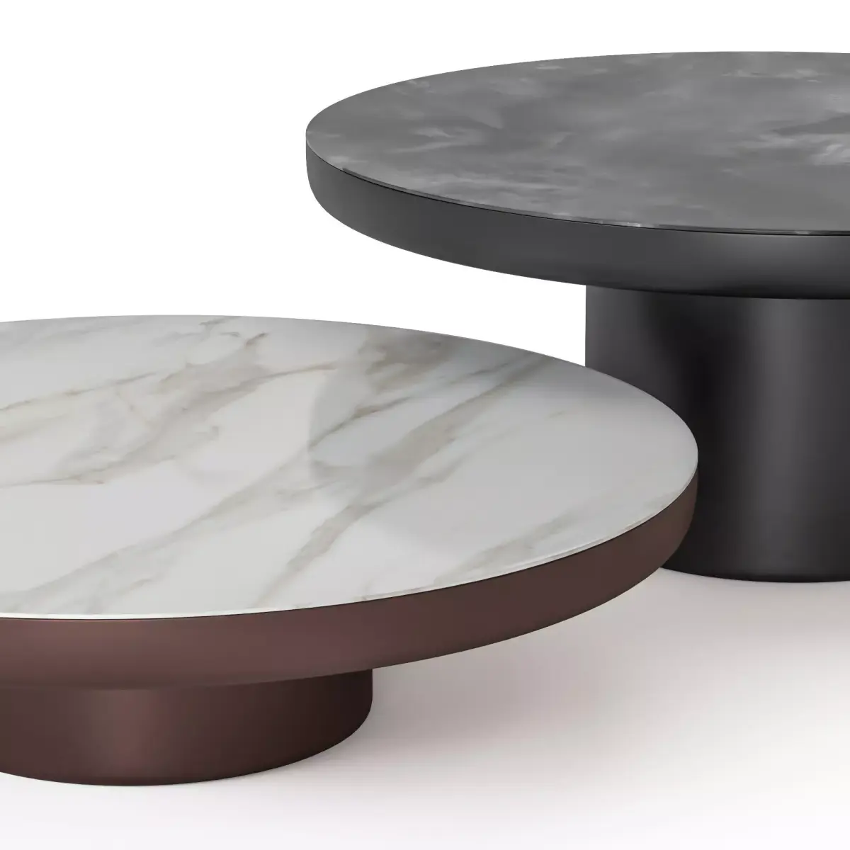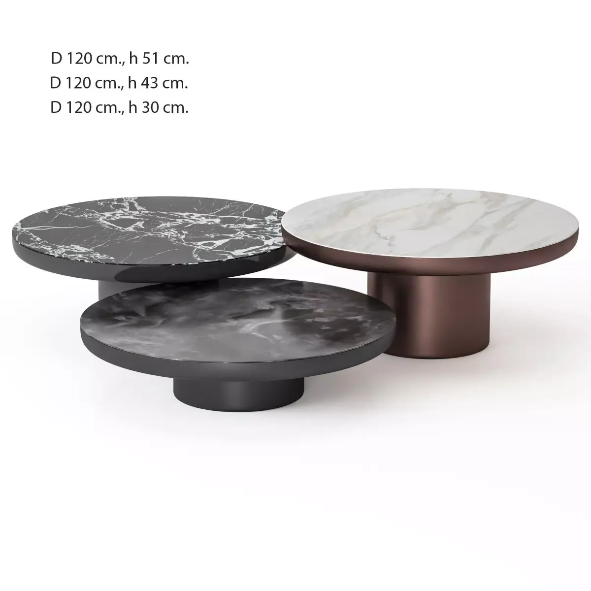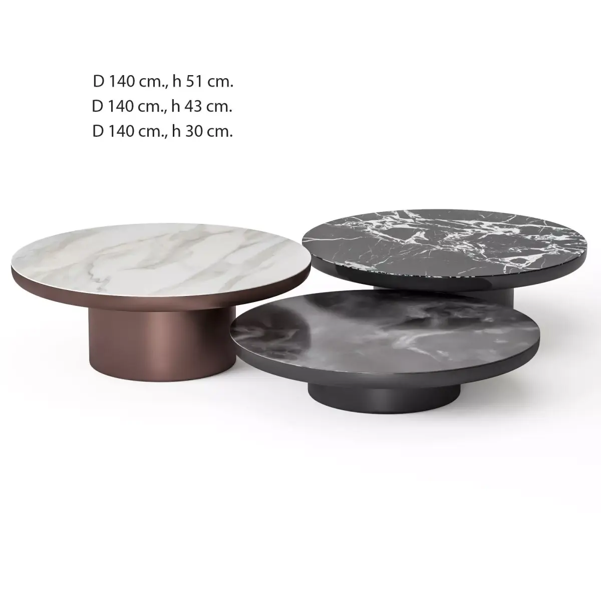 The file contains 7 coffee tables (3 stone materials, 4 base materials) as in the preview.Dimensions: Diameter 120 cm, height 30, 43, 51 cm.Diameter 140 cm, height 30, 43, 51 cm.Rectangular table: length 140 cm, width 100 cm, height 30 cm.