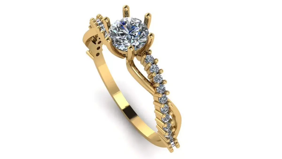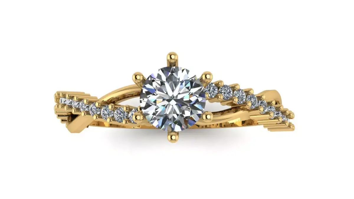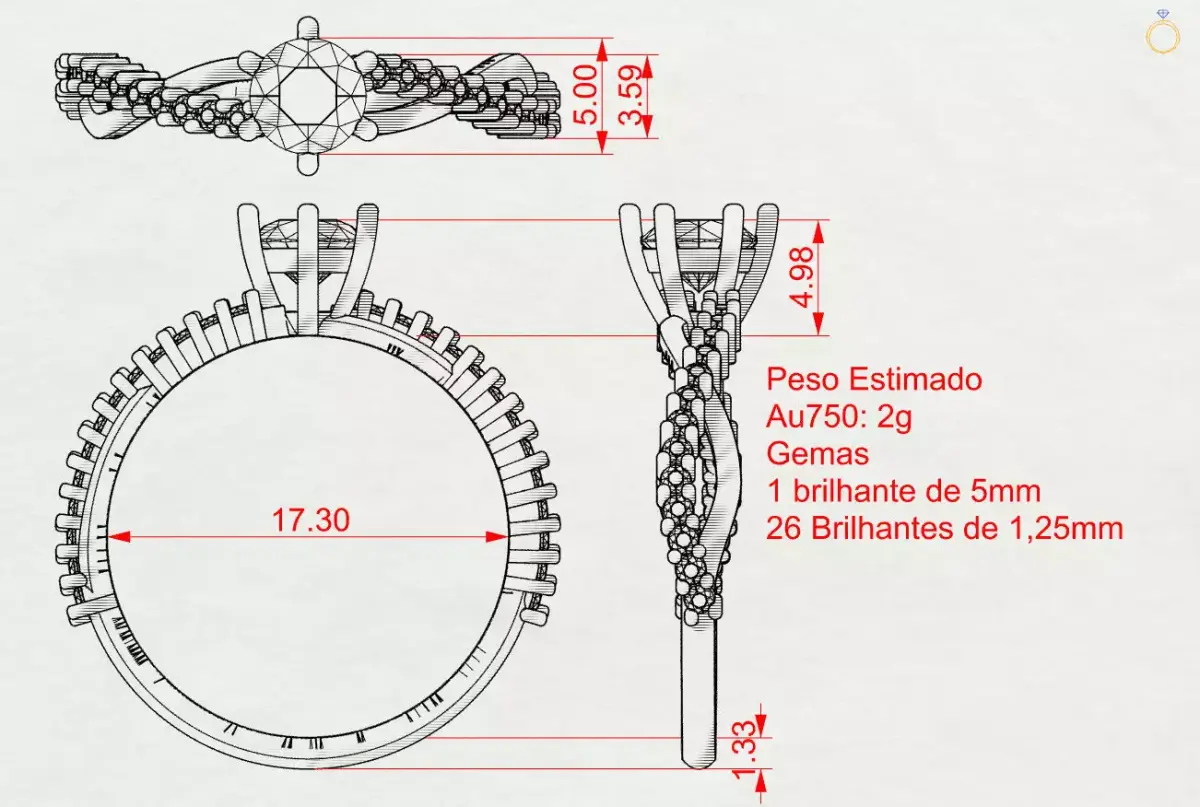 Braided ring featuring a 5mm central brilliant-cut stone and 26 side stones of 1.25mm, estimated weight of 2g when crafted in 18K gold (Au750).Elegant design with an intertwined double band that highlights the central gemstone and ensures balanced sparkle across the ring.All measurements of the piece are shown in the image in millimeters.