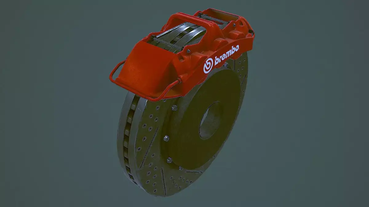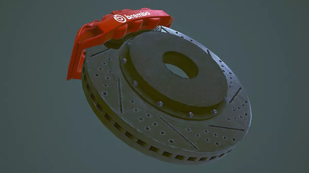 A realistic 3D model of a ventilated, drilled brake disc with a red performance caliper, featuring clean geometry and detailed materials.