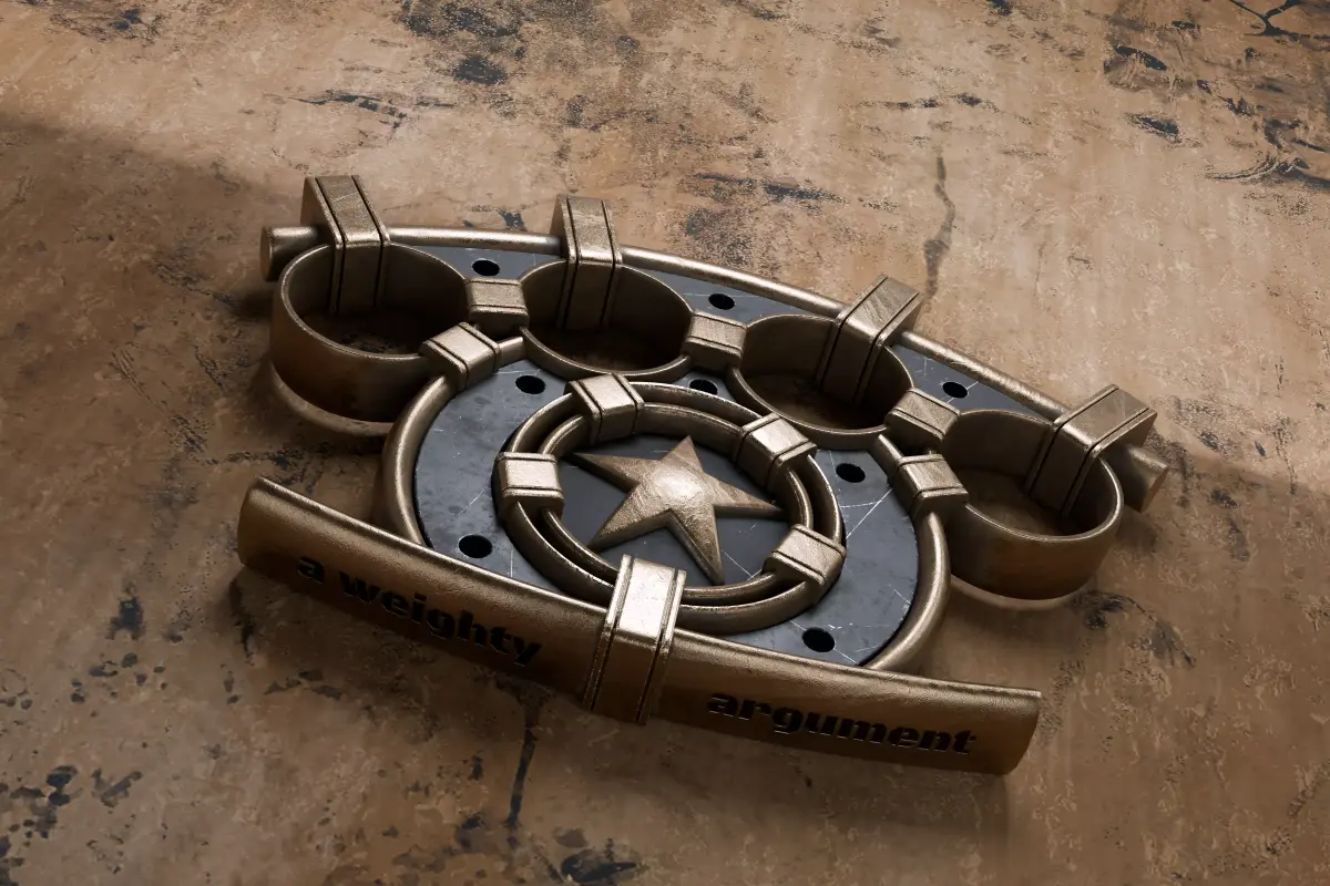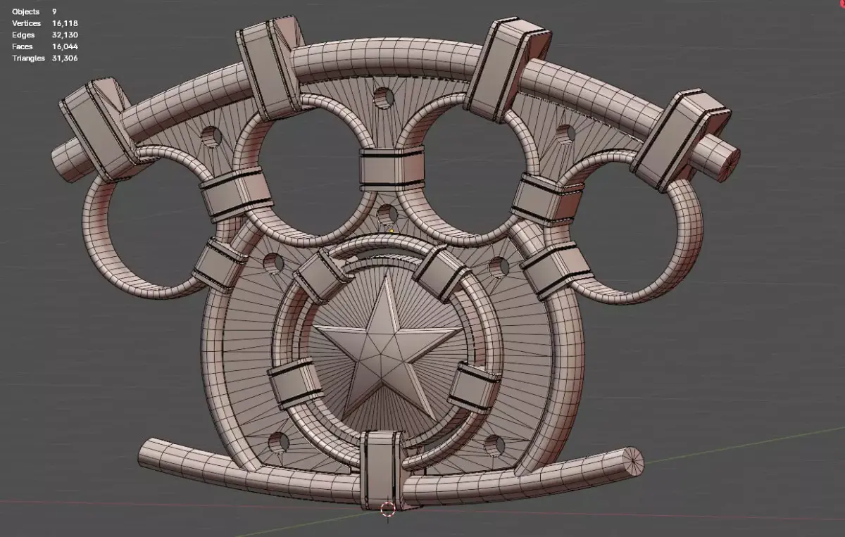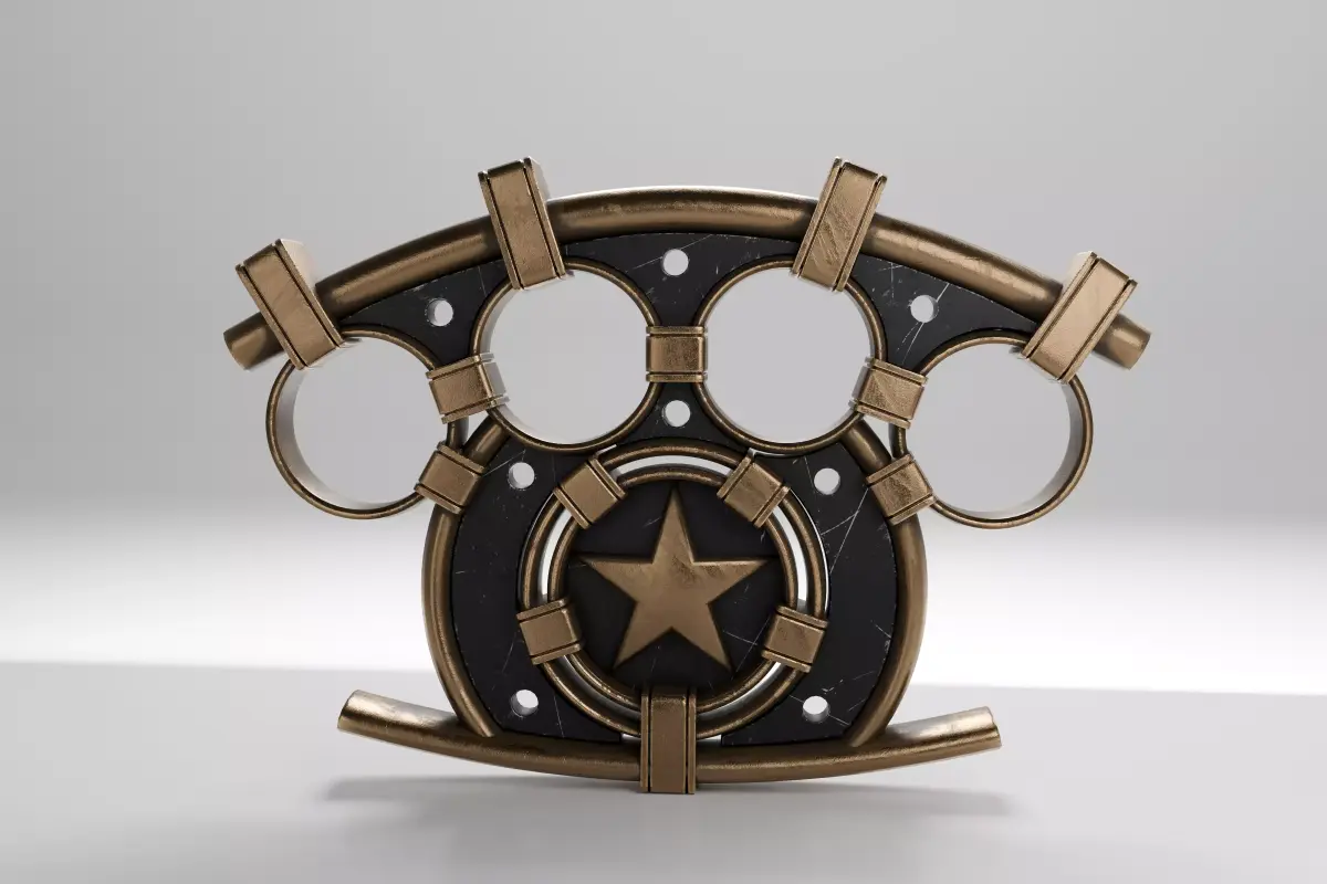 High-quality hard-surface 3D model of a conceptual hexagonal brass knuckle The model was designed as a stylized industrial or sci-fi prop — not a real weapon — suitable for use in games, cinematics, concept art, or product visualization.
