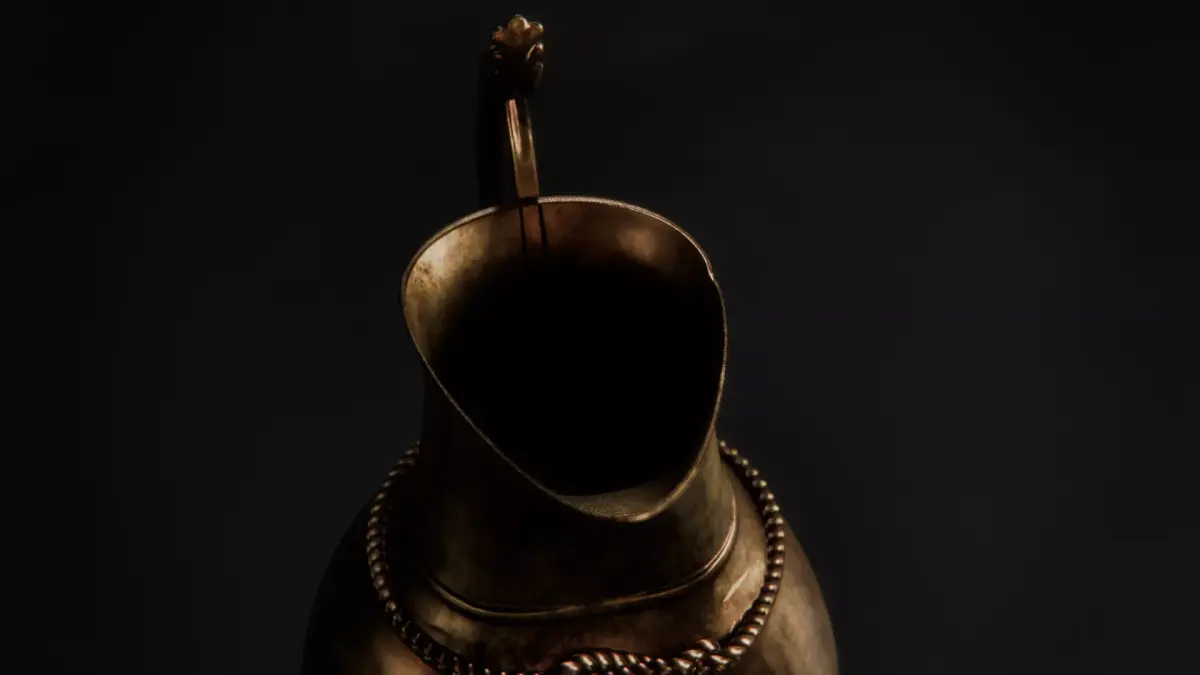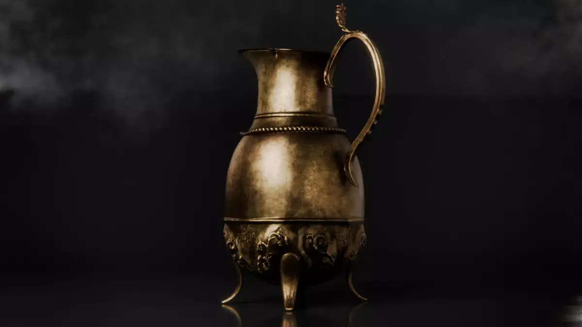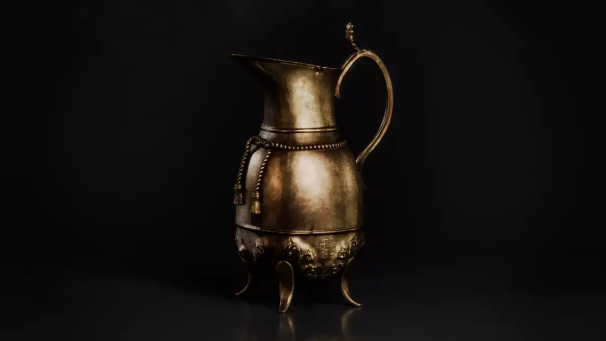 This game-ready brass pitcher is an ornate decorative vessel inspired by pre-industrial metalwork traditions. The body is richly carved, with a sculpted rope binding encircling the neck and floral motifs worked into the four supporting feet beneath. An elaborate handle curves along the back, featuring a leaf-shaped ornament positioned as a counterbalance point for controlled pouring. While suited to medieval and fantasy settings, its craftsmanship also allows it to sit naturally within late 18th–19th century or early Victorian-inspired environments.