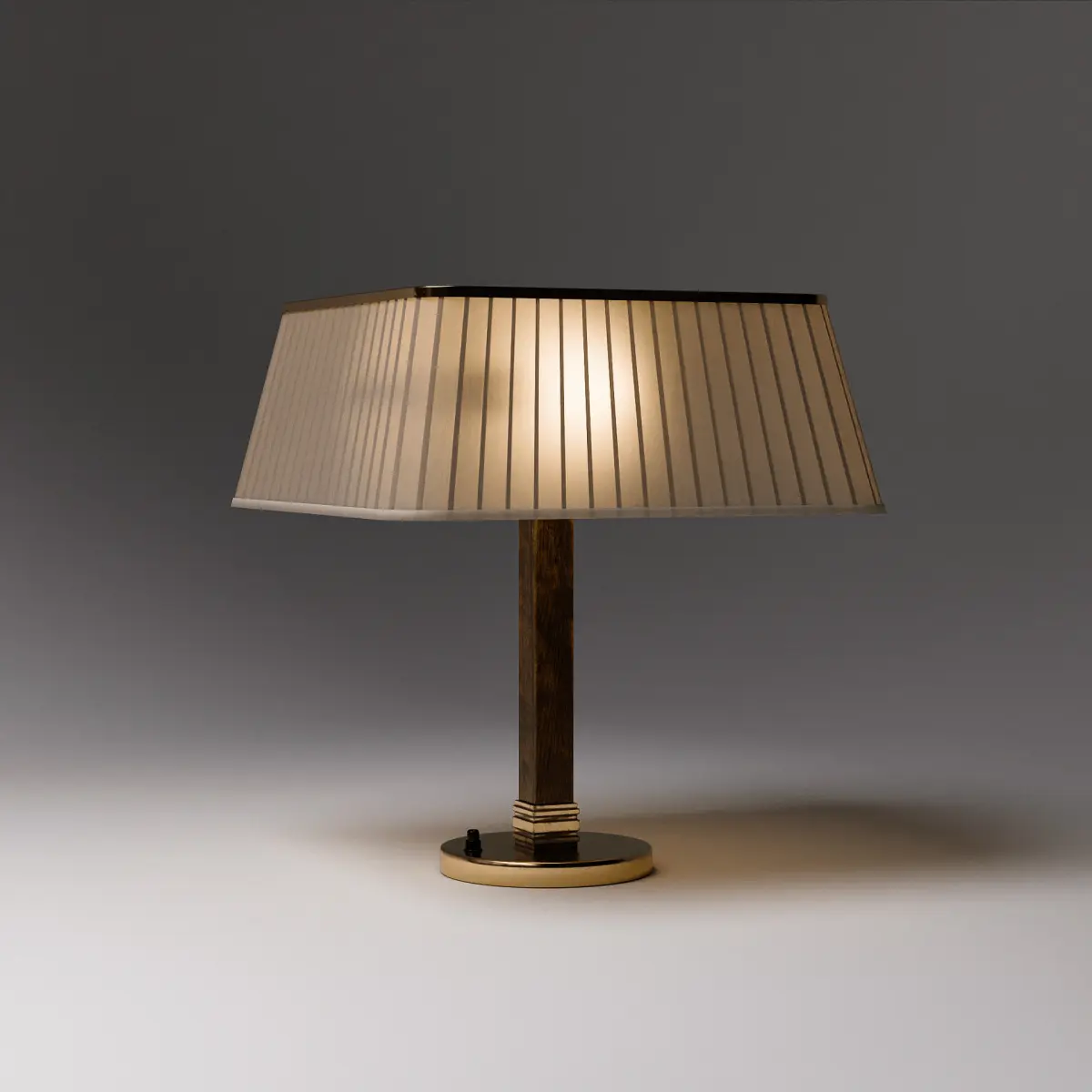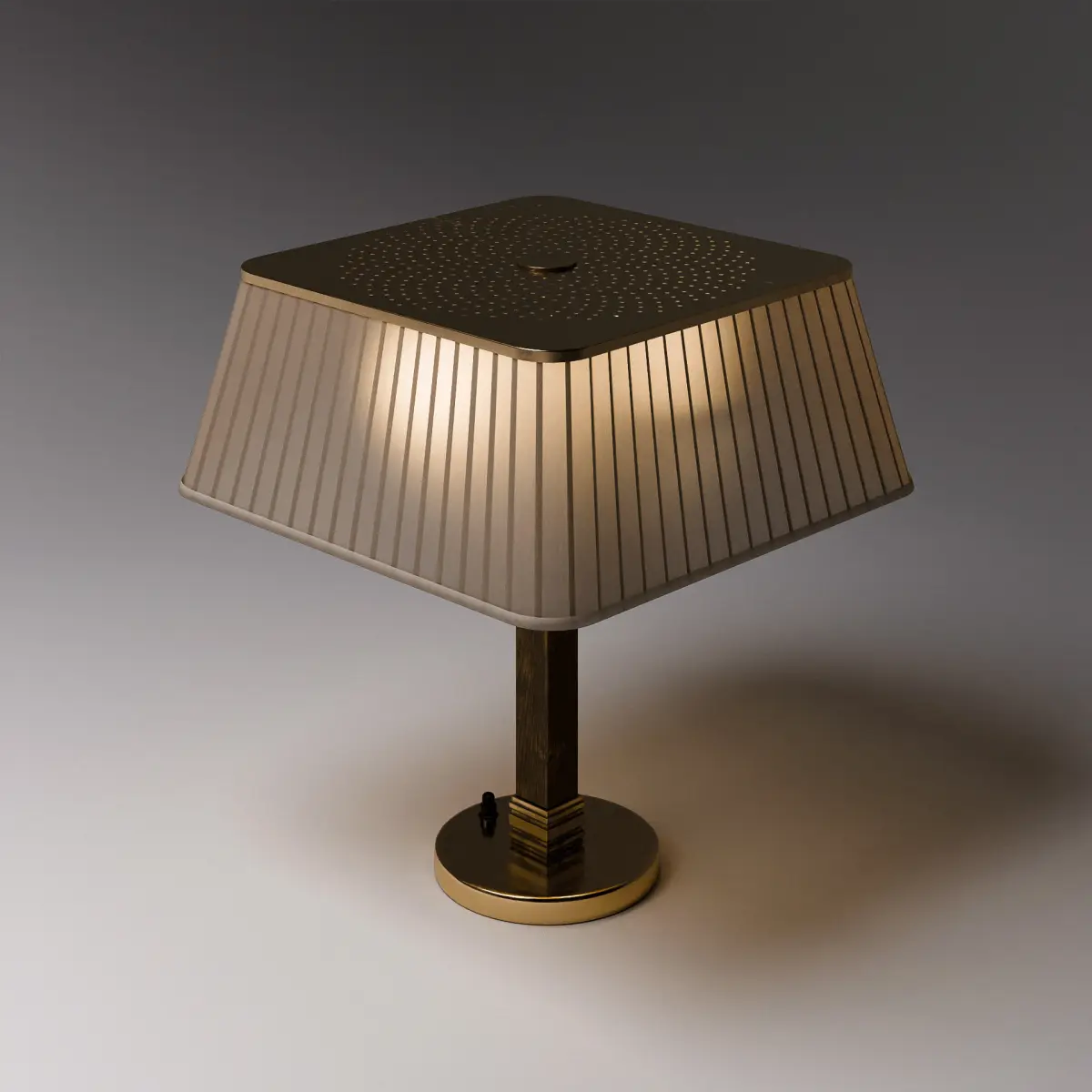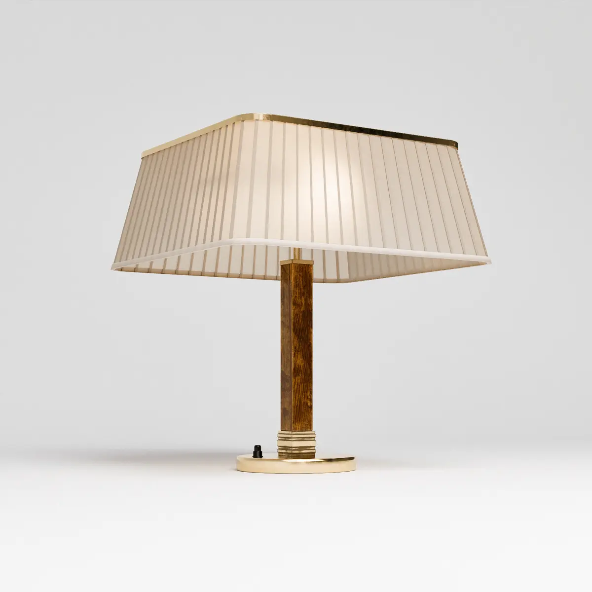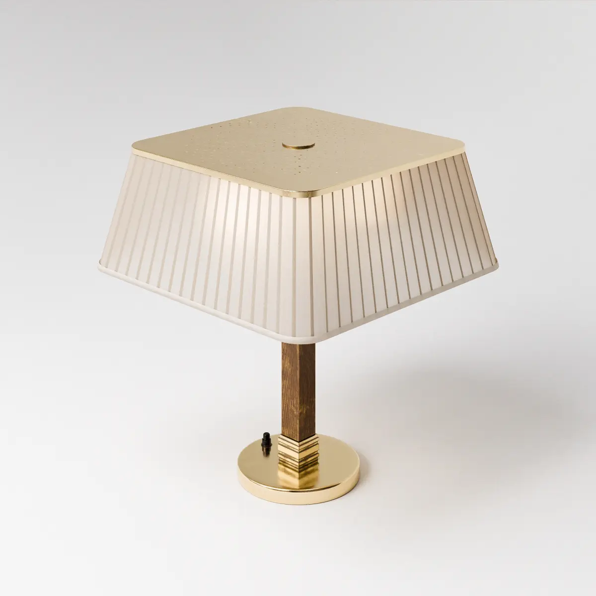 Brass & Silk Table Lamp is a refined 3D model inspired by Paavo Tynell’s mid-century designs for Taito in the 1950s, specifically Model 5066. This lamp features a pleated silk shade with elegant tapering and a distinctive square profile, trimmed in brass for a warm, upscale finish. A perforated brass diffuser crowns the top, offering a delicate glow and vintage detail true to the original. The lamp's base pairs polished brass with a vertically grained wooden stem, creating a timeless contrast of materials. Ideal for interior visualizations that call for a touch of Scandinavian elegance, this piece fits seamlessly into modern, vintage, or eclectic design scenes.