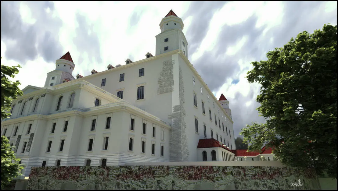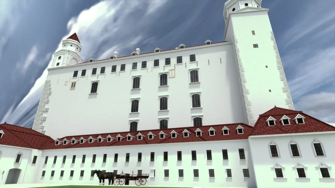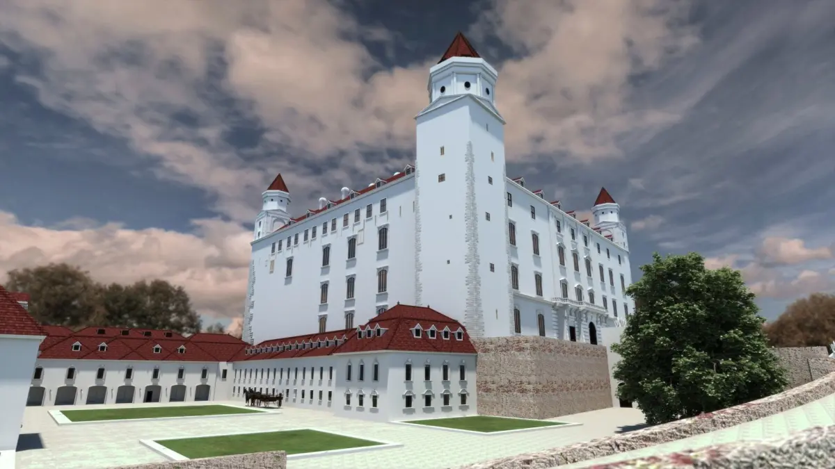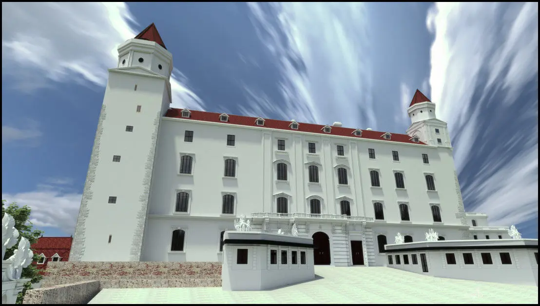 Model of the Bratislava royal castle in the shape of the 18th century with the base of the garden.The buildings called New palace /Theresianum/ , winter riding hall and summer riding hall are free artistic adaptations created in the base of the project of F.A. Hillebrandt discovered in Wien archives.