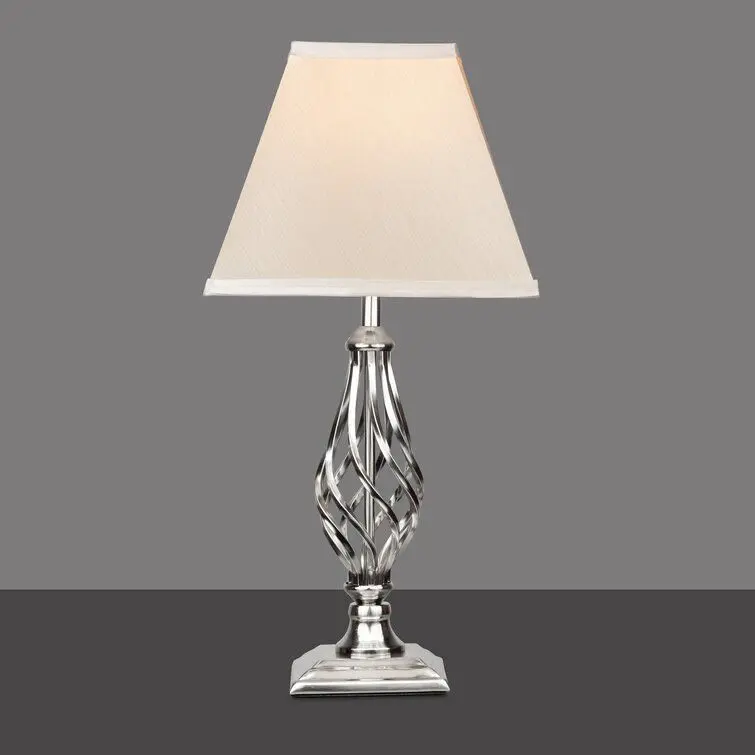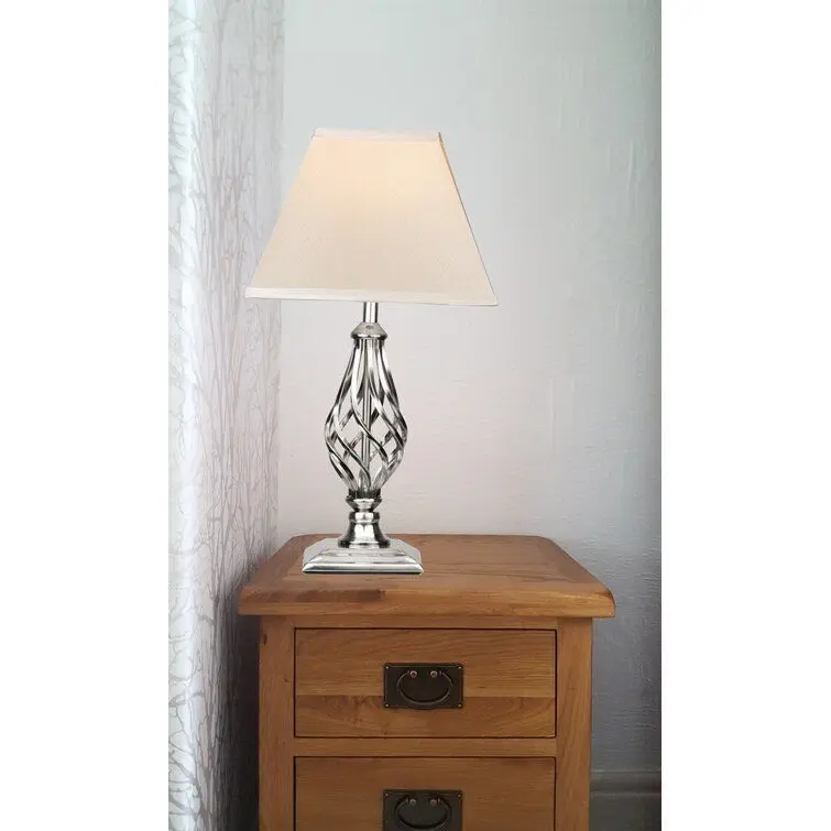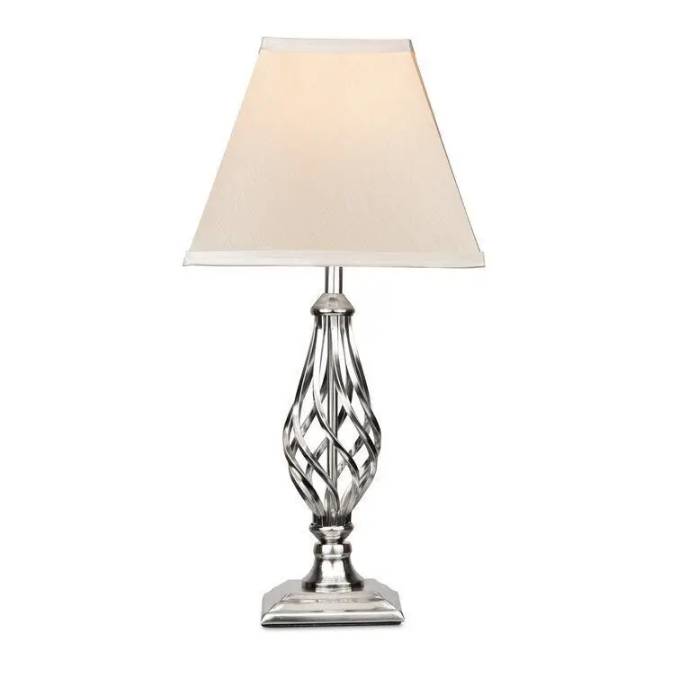 - Timeless and elegant, this table lamp is a good match for traditional interiors. It stands on a square metal base with a barley twist design. It accommodates a single light bulb that shines from behind an ivory satin-effect square shade. This lamp is operated via an in-line switch. A light bulb is not included.
