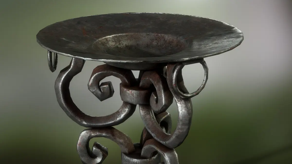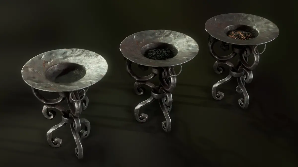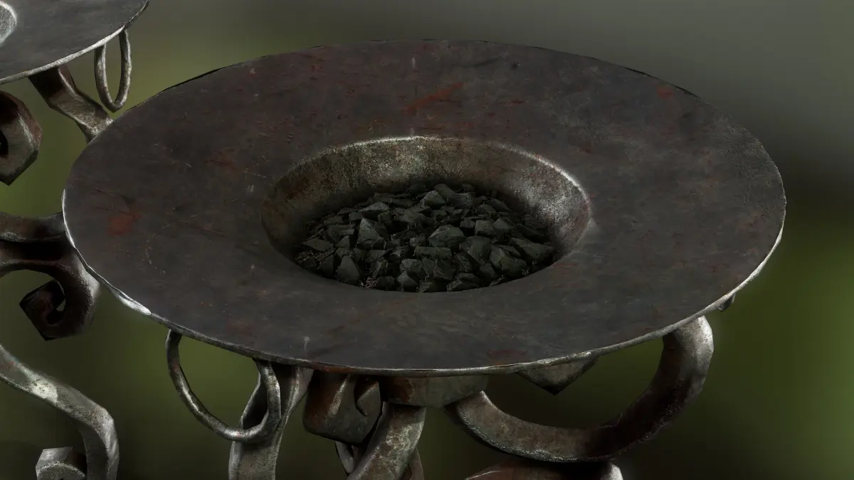 A metal brazier with coal. Rendered in Marmodet toolbag 4. Contains two PBR texture sets, 4096x4096 .TGA texture files. Has collisions. Game ready. Coal material has a burning variation.