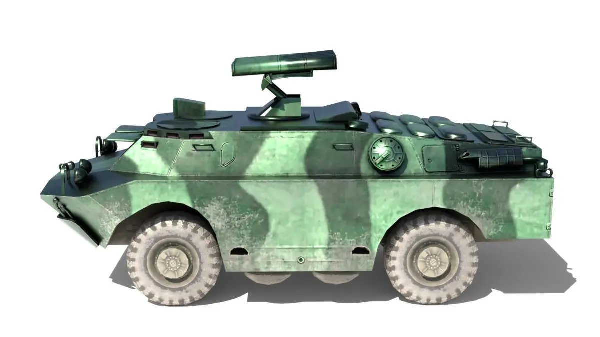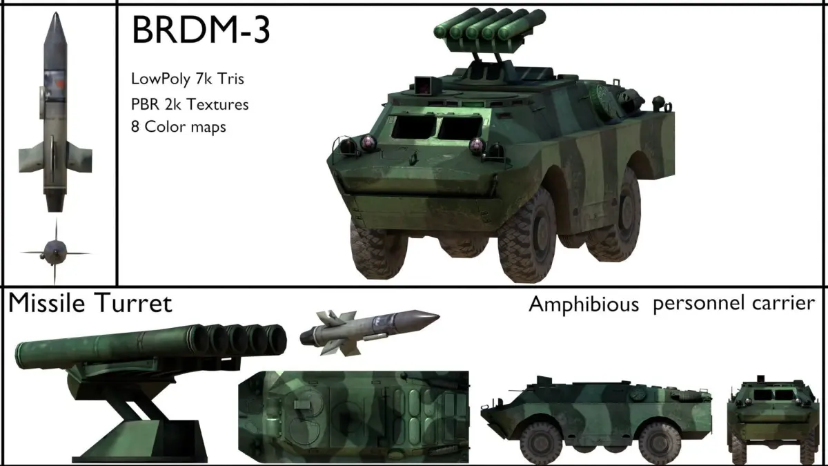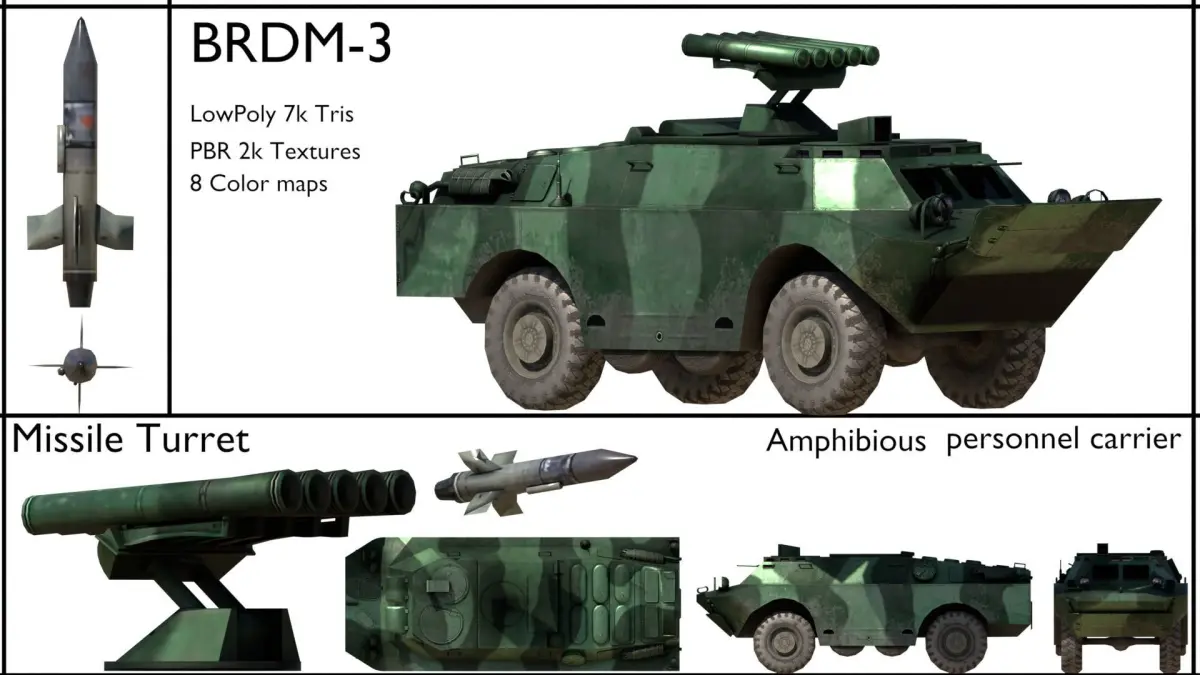 Blender Model , lowpoly ,rendered with cycles3 objects (BRDM body , wheels, and a missil)PBR 2k Textures , the body part has 8 differnt color/diffuse maps