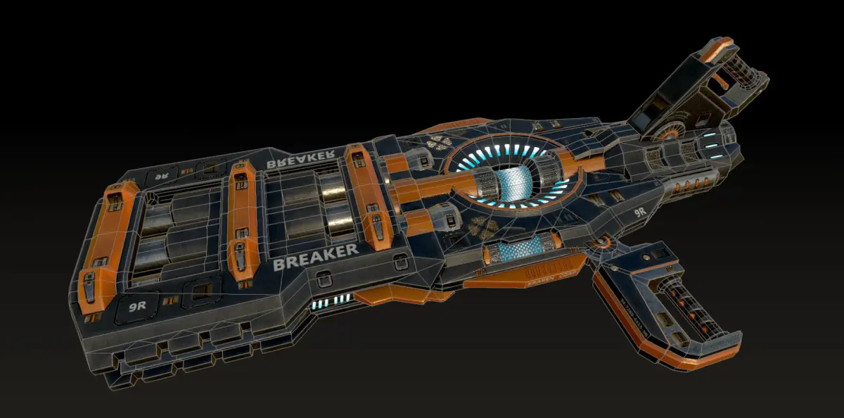 This is a weapon called the ‘Breaker’. It is part of a series of HD weapons I am currently designing for games. The Breaker is Inspired by the gauss Rifle from Doom (2016).