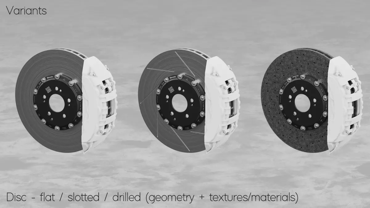 - Carbon ceramic brake disc (no friction): 4x 4K PNG (Color, Height, Normal, Roughness)