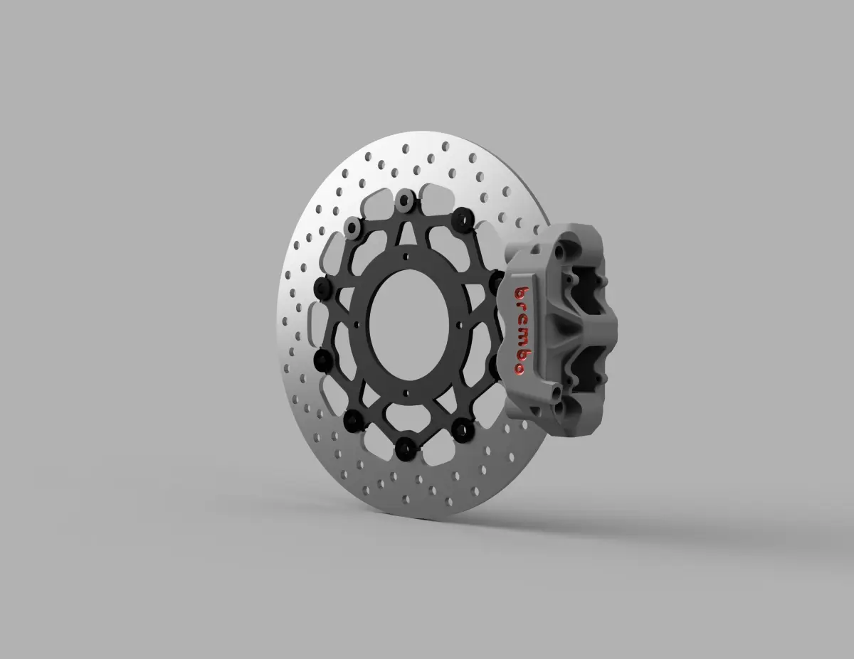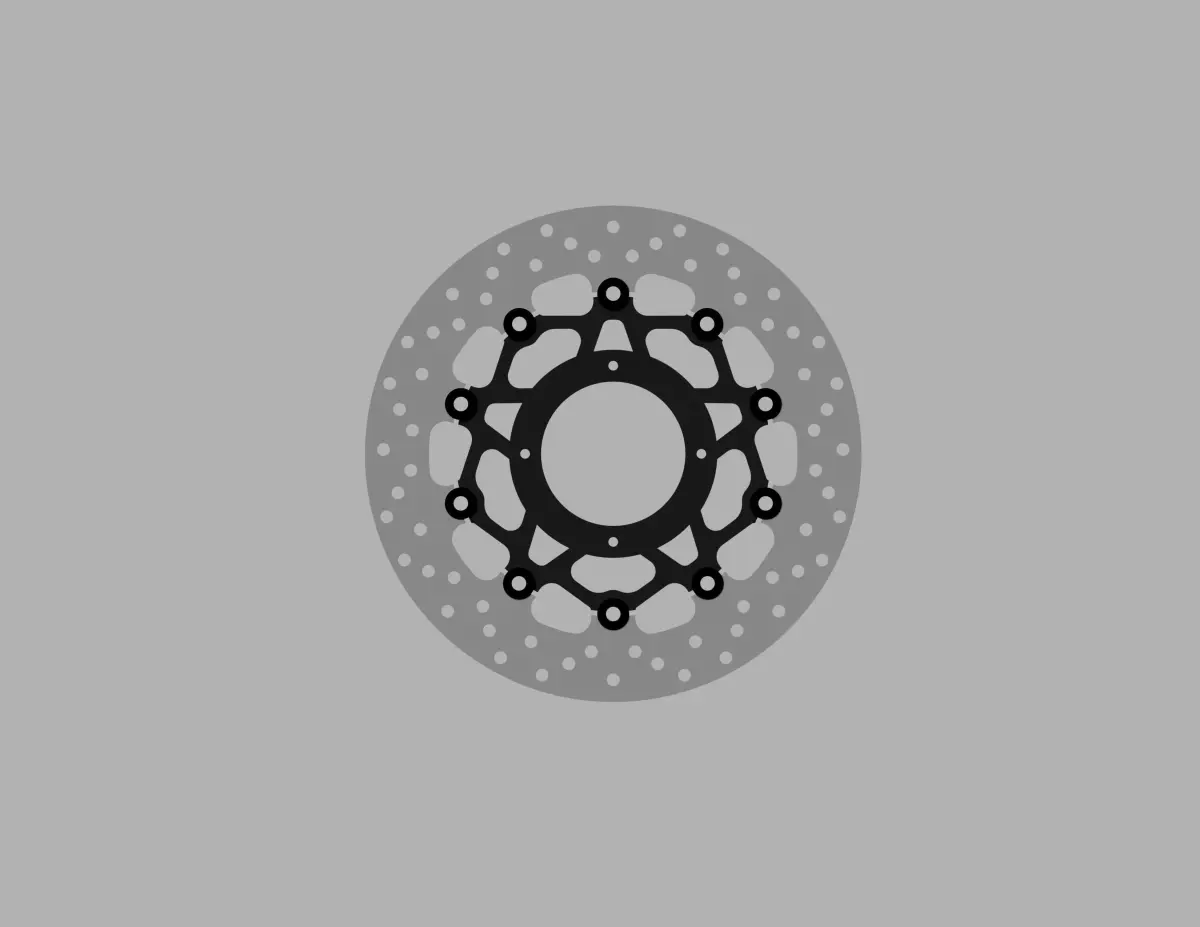 Floating Brembo motorcycle brake disc 320mm composed of the stainless steel braking band, connected by means of dragging pawls to the bell made of aluminum alloy, CNC machined and subsequently anodized.Ideal for sport bikes, naked and motard.Scale 1:1