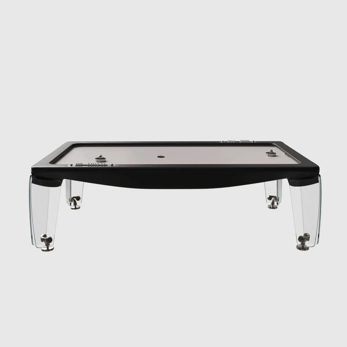 Rectangular glass and steel air hockey table.