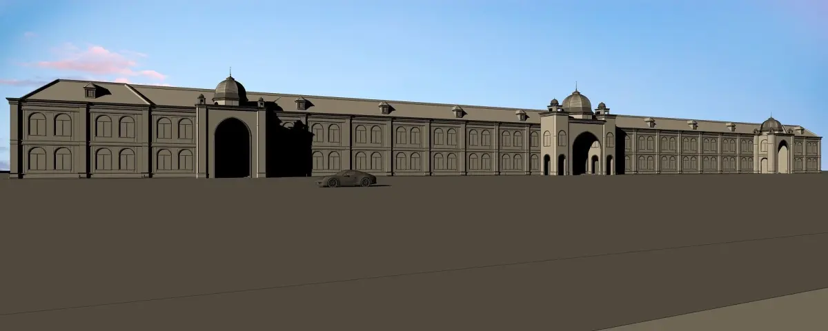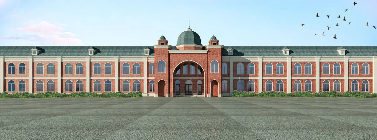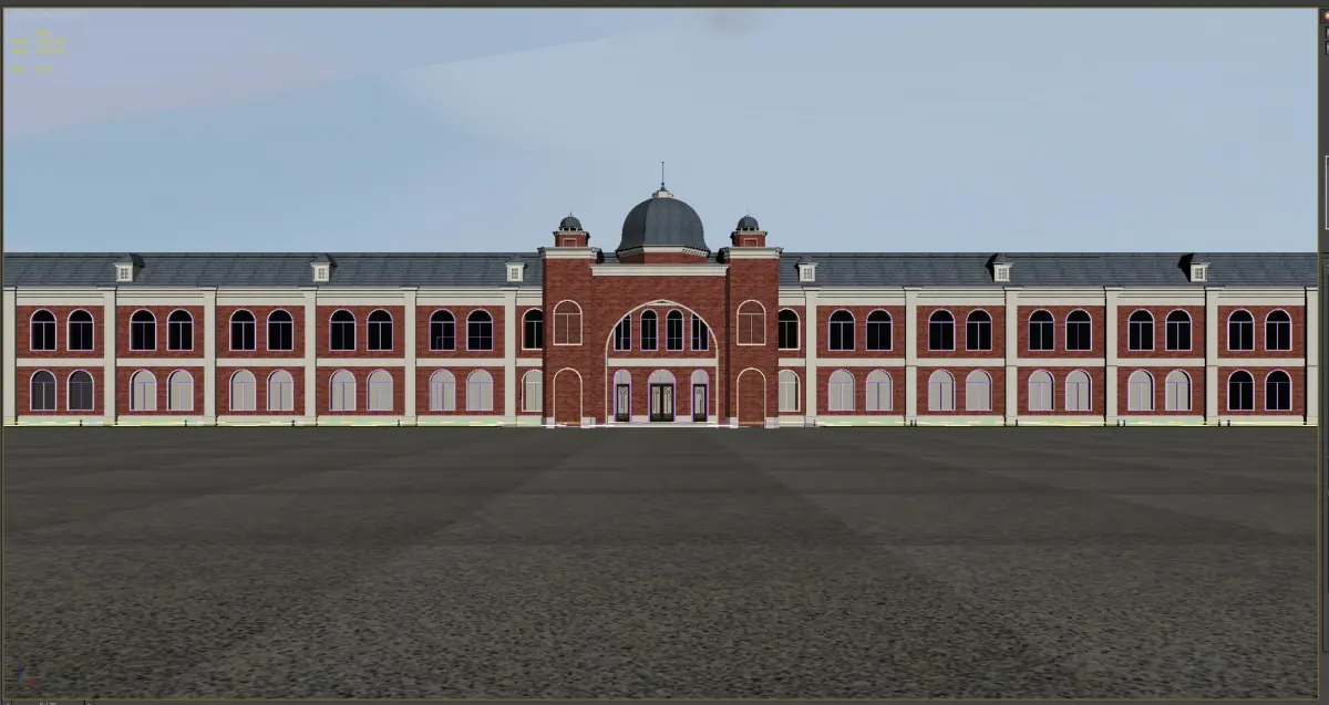 facade material contain brick , stucco ,and metal with ornaments.