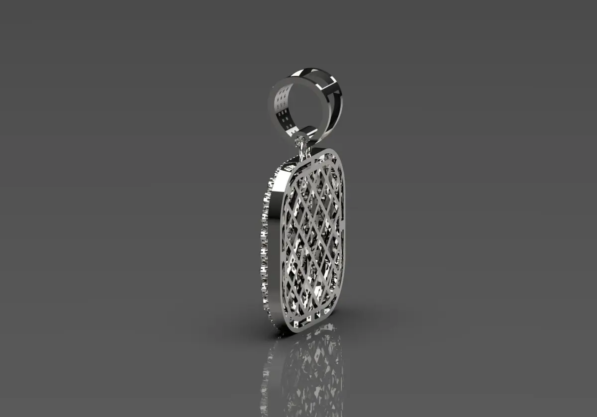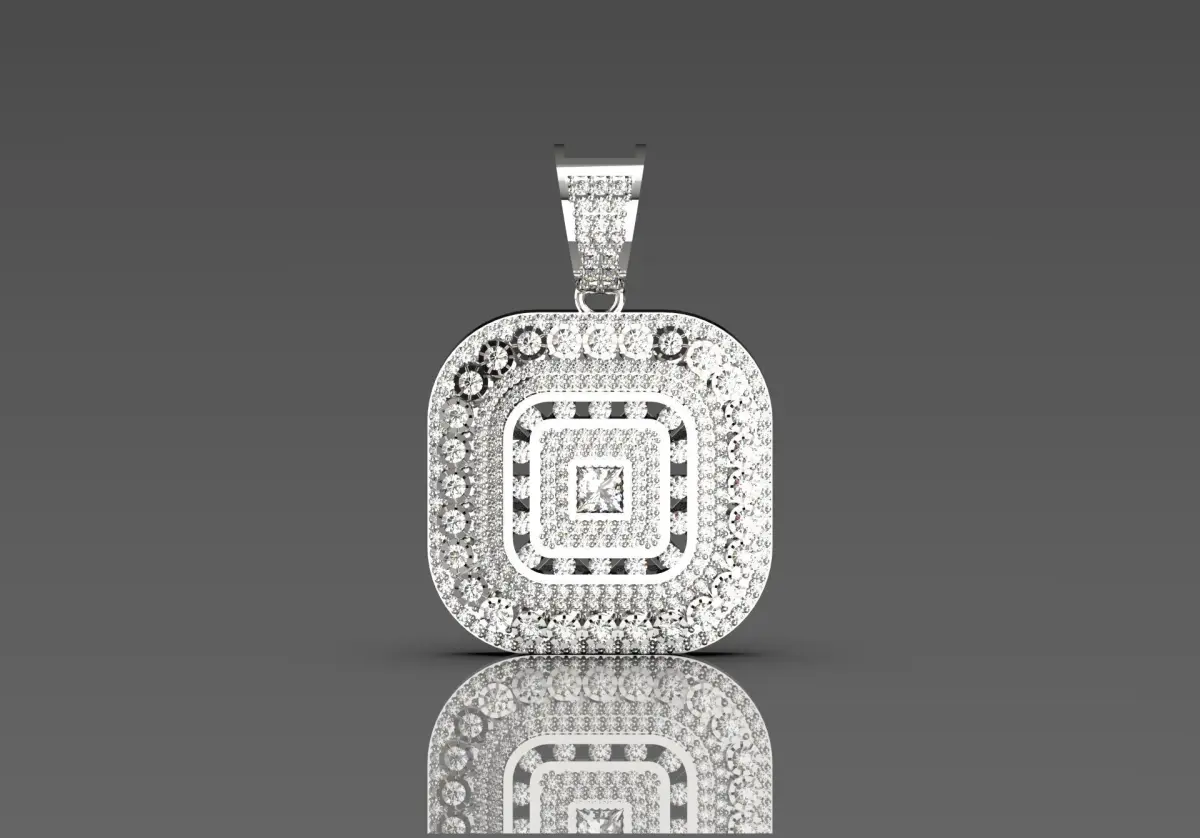 This pendant features a striking square design beautifully crafted in polished silver or white gold. At its center, a geometric pattern is surrounded by a border of sparkling stones that create a captivating layered effect. The surface is intricately paved with small, sparkling diamonds or diamond-like stones, adding to its brilliance and giving it a luxurious feel. The polished finish reflects light beautifully, while the toggle at the top allows for easy attachment to a chain. This beautiful piece embodies a modern aesthetic, making it a great accessory for both formal and informal occasions.