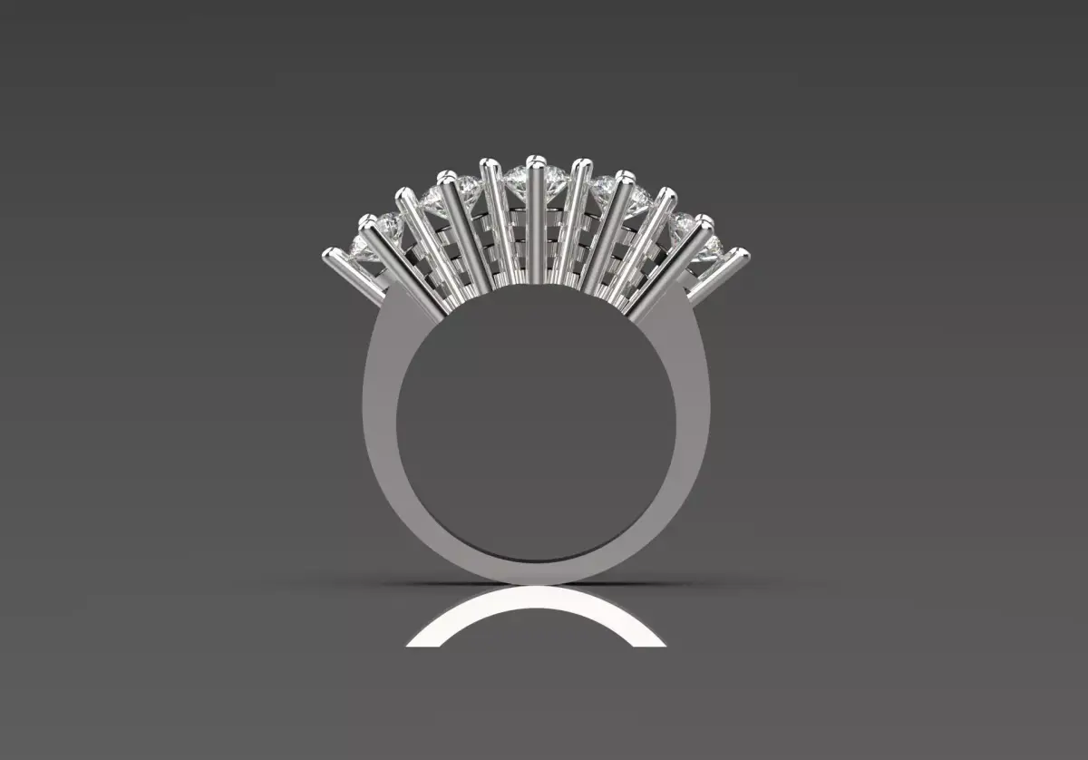The diamonds are arranged in a gentle arc, creating a delicate fan-like shape and adding a sense of movement to the piece. The band itself is sleek and sleek, tapering as it approaches the perimeter, enhancing the visual impact of the gemstones.