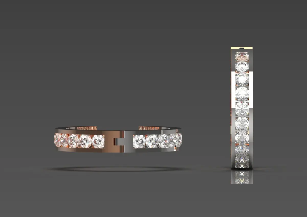 The earrings feature a row of sparkling gemstones, high-quality diamonds, set on the outer edge of the hoops in a rail setting. This arrangement enhances their brilliance and reflects light beautifully. The stones are arranged in a way that maximizes their visibility and draws the eye with every movement.