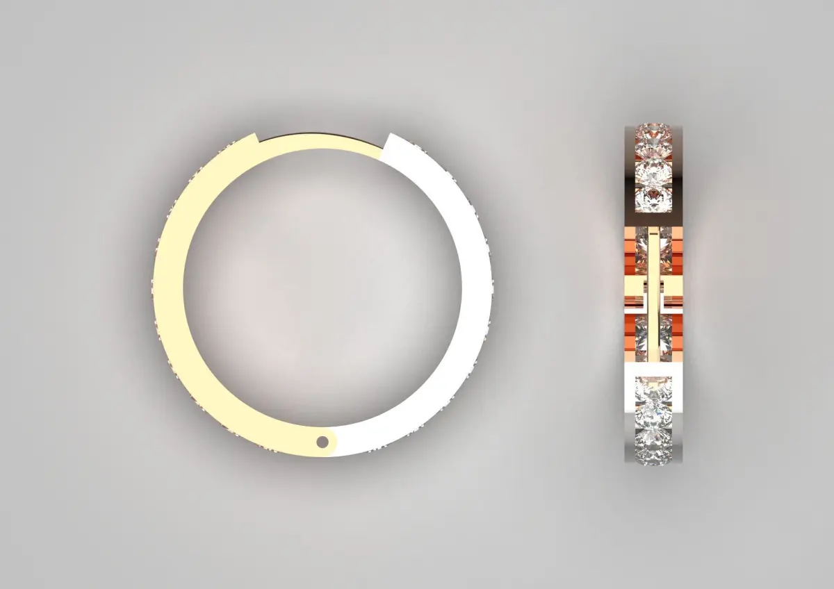 The earrings feature a combination of two gold metals: a warm rose gold on one half and a shiny white gold on the other. This two-tone effect adds visual appeal and sophistication.